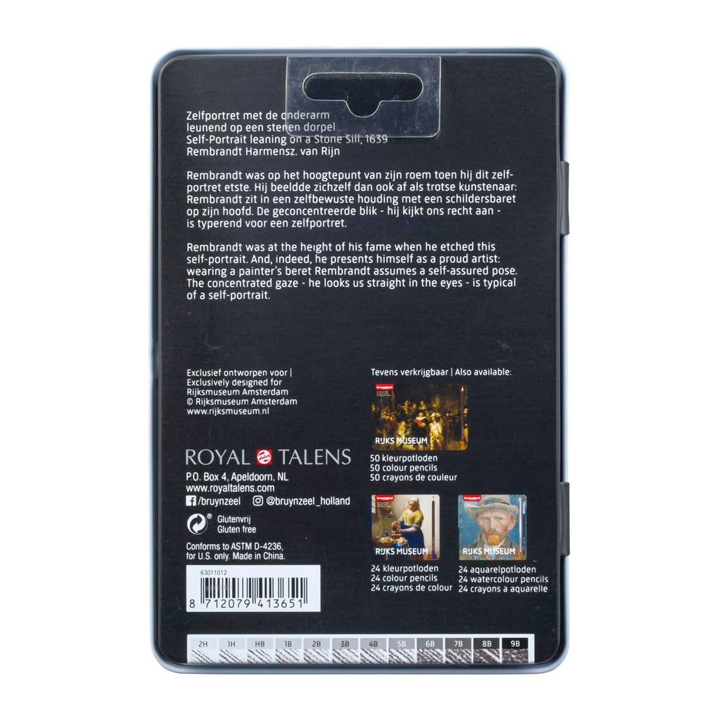 Een kunstig blik met 12 verschillende kwaliteitspotloden. De Bruynzeel Rijksmuseum Grafietpotloden zijn superstevig en voorzien van een dikke, sterke grafiekkern. Dit maakt dat je er geweldige kunstwerken mee kunt schetsen, net zoals Rembrandt van Rijn akte, die op de voorkant van het blik staat!