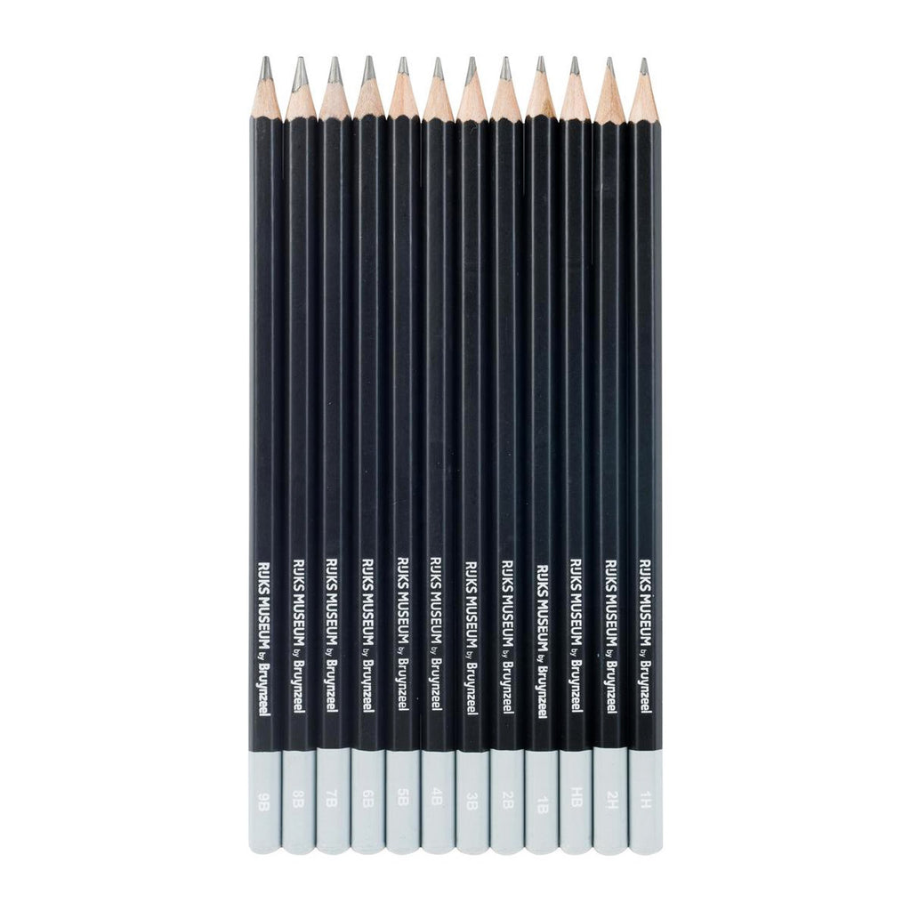 - 12 zwarte potloden met unieke hardheid: 2H, 1H, HB, 1B, 2B, 3B, 4B, 5B, 6B, 7B, 8B en 9B