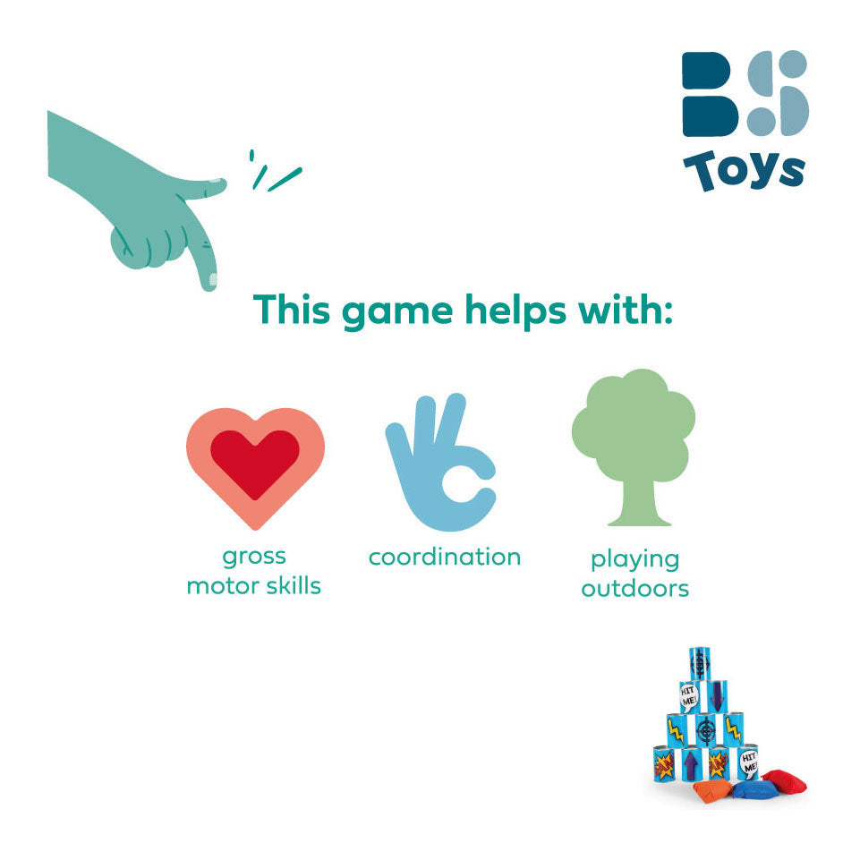 Blikkenwerpen blijft geweldig. Deze mooie blauwe variant staan grappige figuren op afbeeldingen. Wat leer je van dit spel? • grove motoriek • sturing • buiten spelen Materiaal: metaal, stof. Inhoud: 10 blikken, 3 werkpzakjes. Afmeting: de blikken zijn 10 centimeter hoog, diameter 6 centimeter. Leeftijd: vanaf 3 jaar oud. Spelers: 1 tot 3.