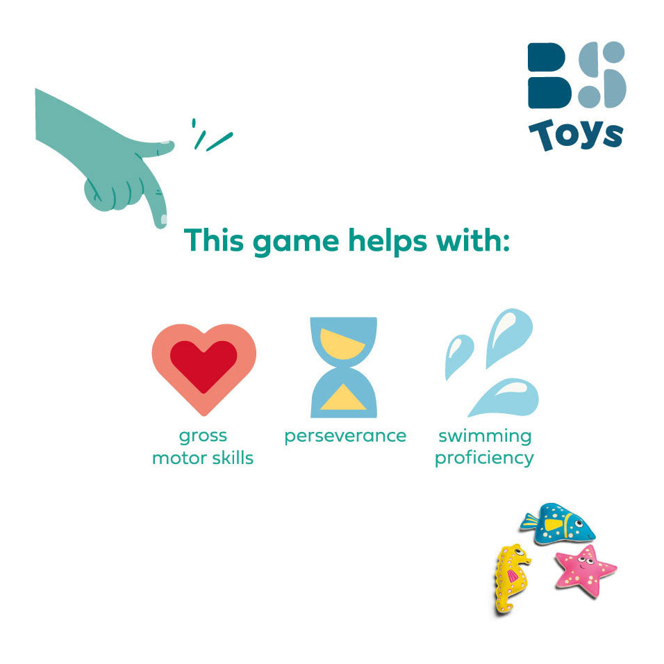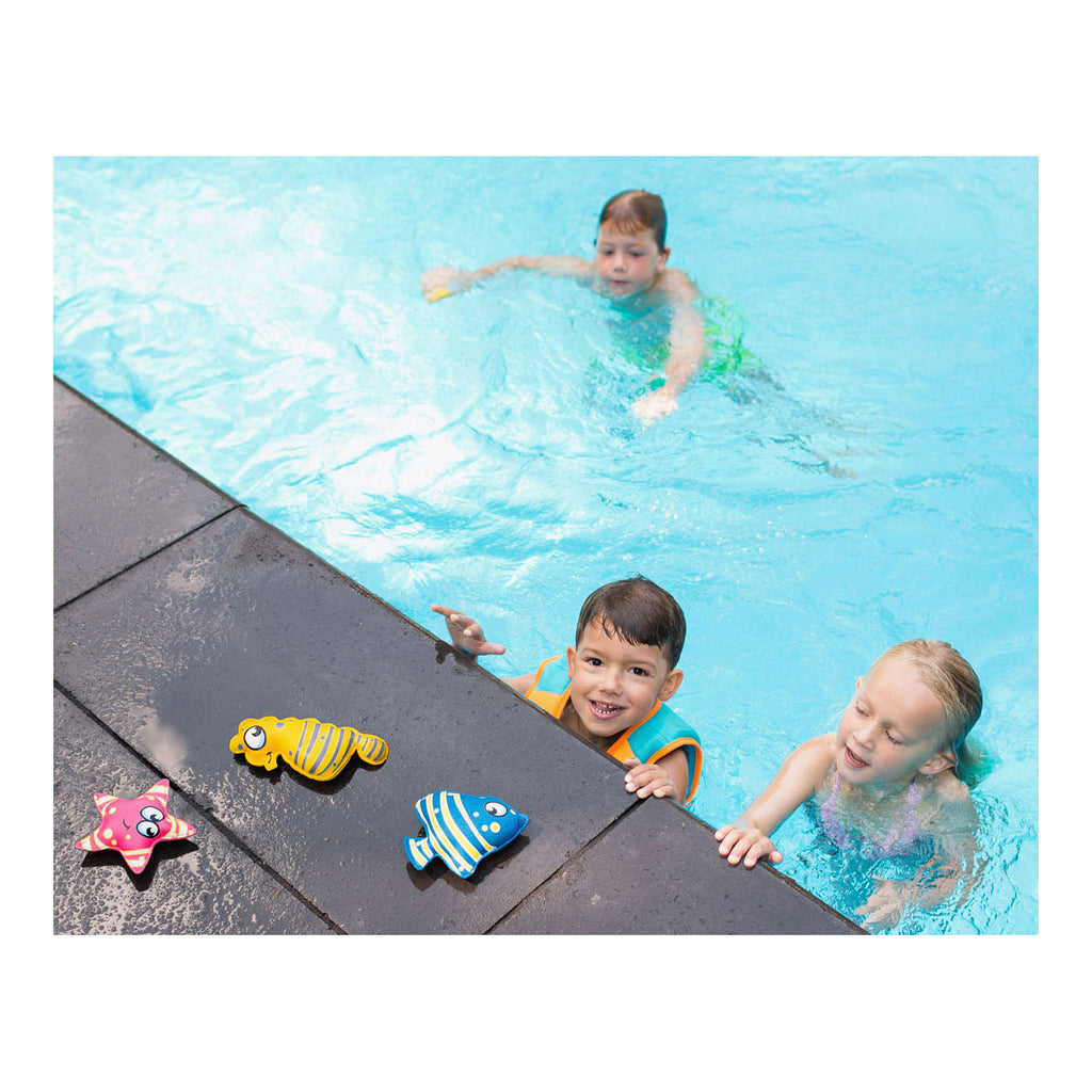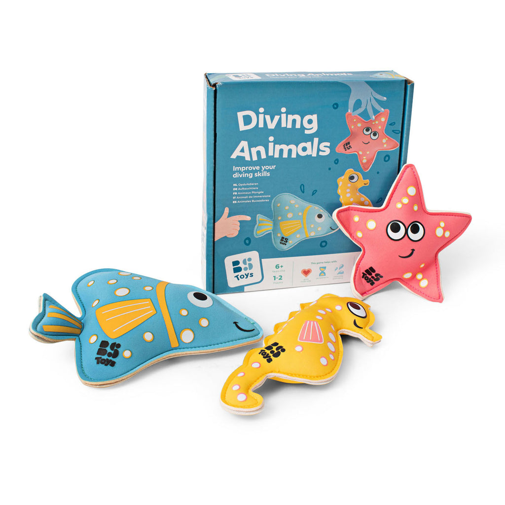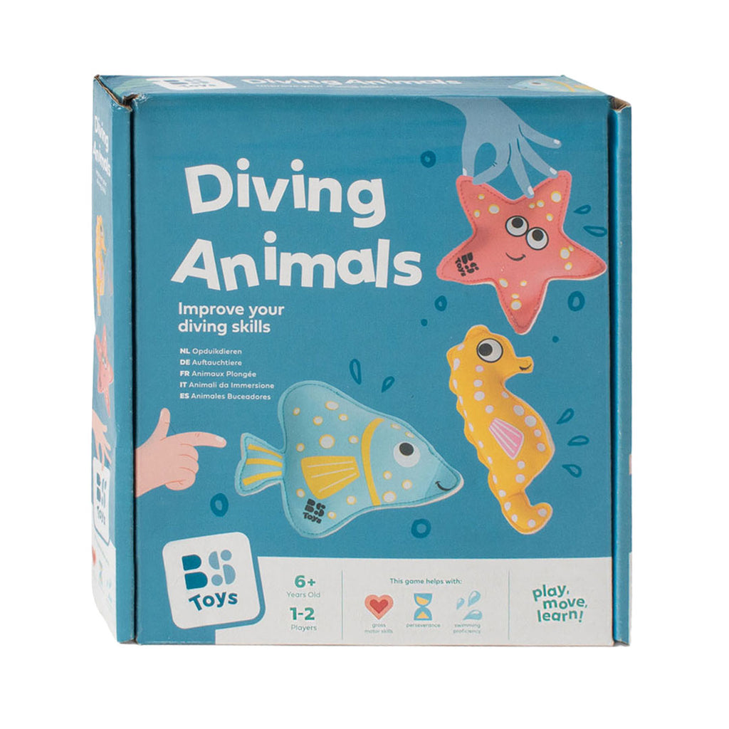 Oefen je onderwatervaardigheden met deze leuke duikdieren. Wat leer je van dit spel? • grove motoriek • doorzettingsvermogen • zwemvaardigheid Materiaal: neopreen (synthetisch rubber), zand. Inhoud: 3 stuks duikdieren. Afmeting: ongeveer 14 centimeter. Leeftijd: vanaf 6 jaar. Spelers: 1 tot 2.