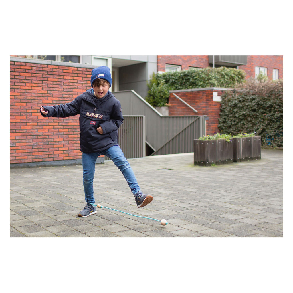 Retro spel in een stijlvol jasje; doe je voet door de lus en slinger de bal in de rondte. Hoelang kun jij dansen en springen zonder het touw te raken? Kenmerken • Kleur: Blauw & Hout • Geschikt voor: Kinderen • Leeftijd: Vanaf 6 jaar • Materiaal: Vurenhout • Aantal spelers: 1 speler • Lengte touw: 75 cm