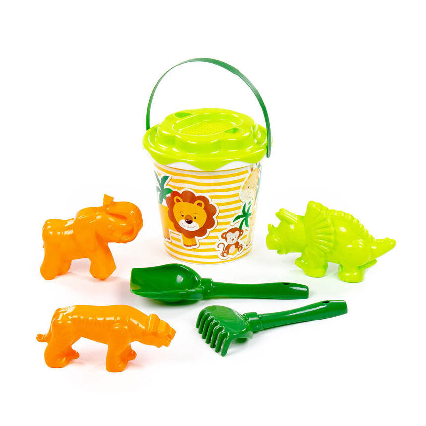 Cavallino XL Dino Emmerset met emmer, zeef, hark, schep en 3 zandvormne. Afmetingen: 18 x 27,5 centimeter.