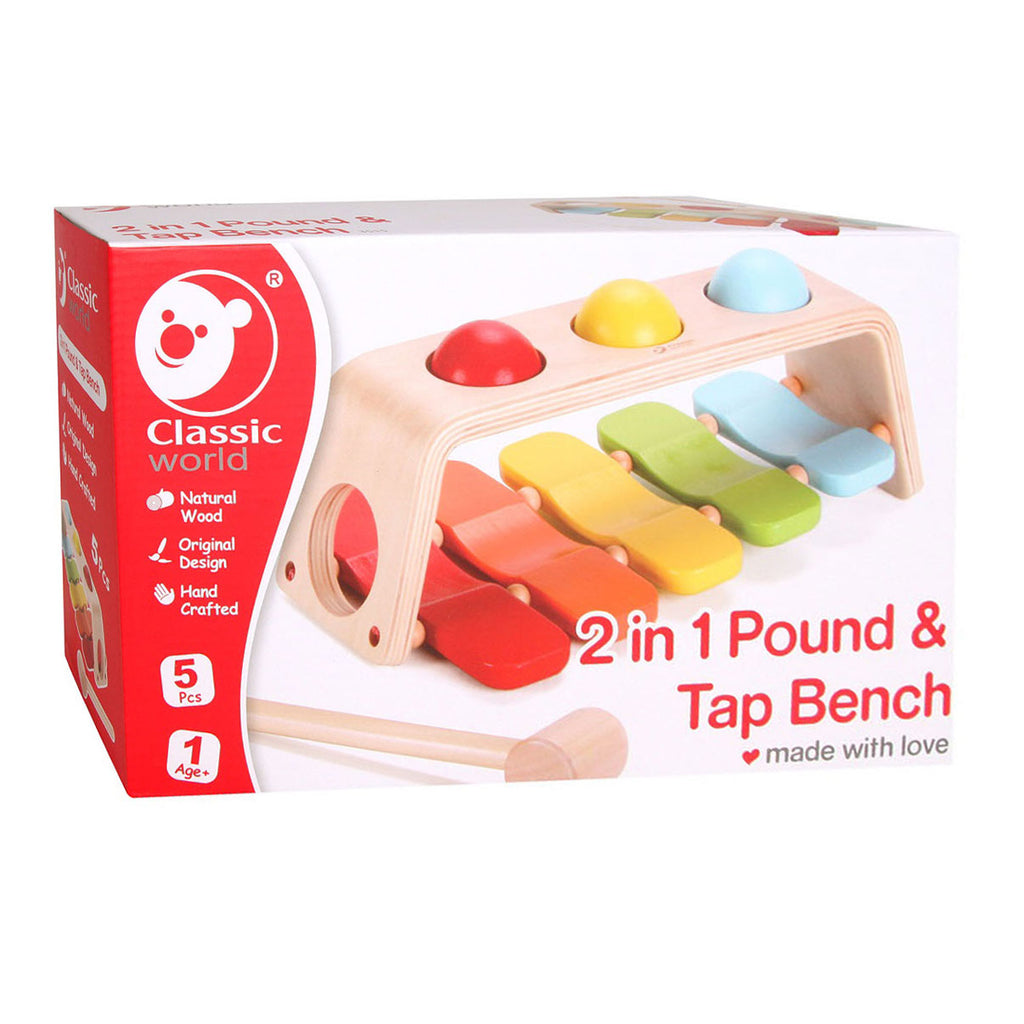 De Classic World houten hamerbank met xylofoon is een veelzijdig speelgoed dat kinderen urenlang plezier zal geven. Met deze hamerbank kunnen kinderen op twee verschillende manieren spelen. Ze kunnen de ballen door de openingen slaan en zien hoe ze naar beneden vallen en over de ballenbaan rollen. Dit stimuleert hun motoriek en helpt hen de oorzaak-gevolgrelaties te begrijpen.