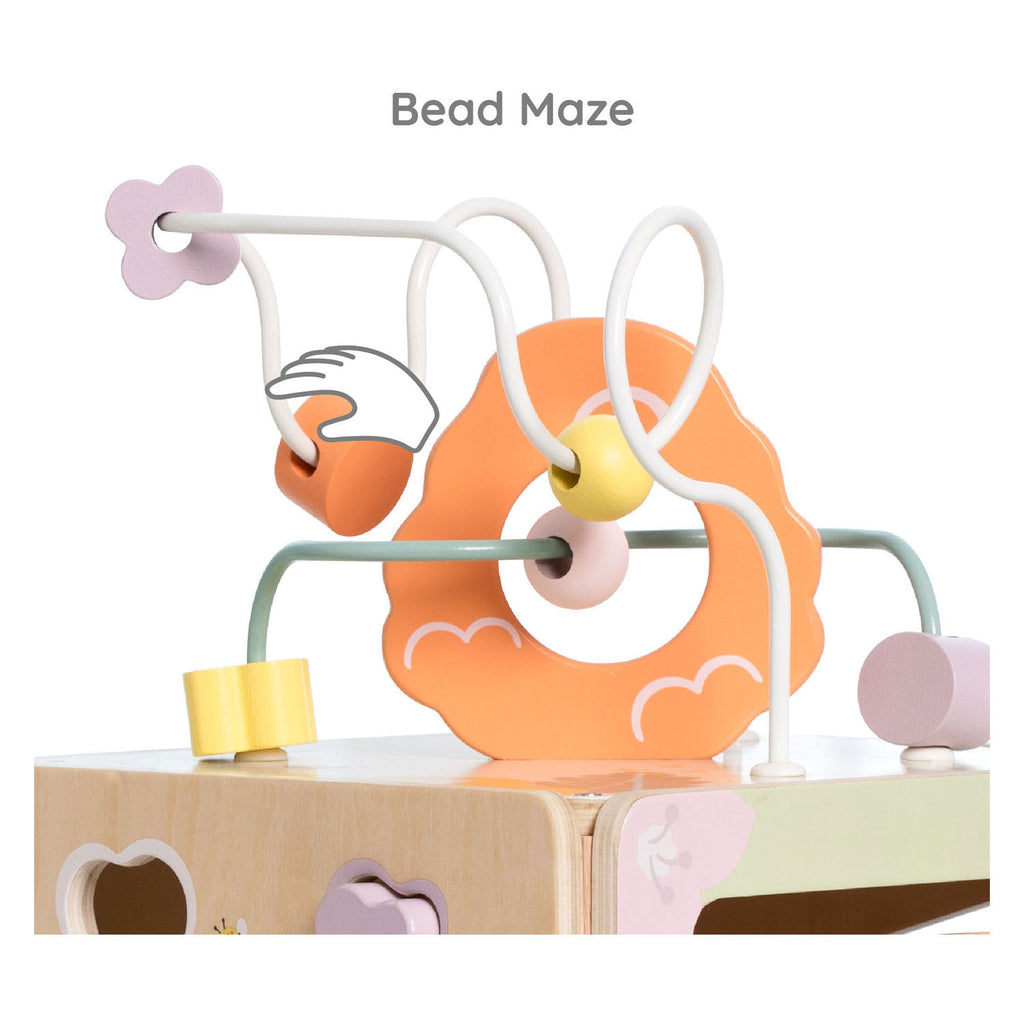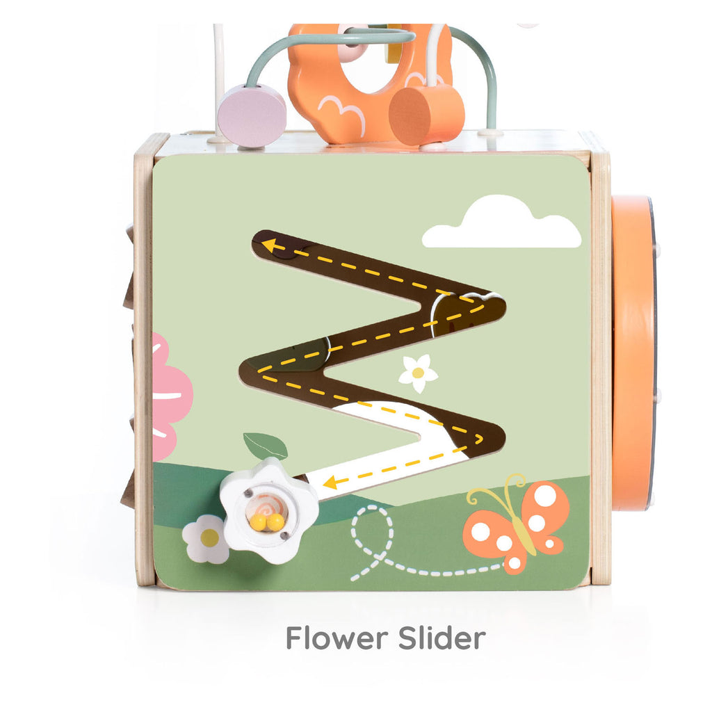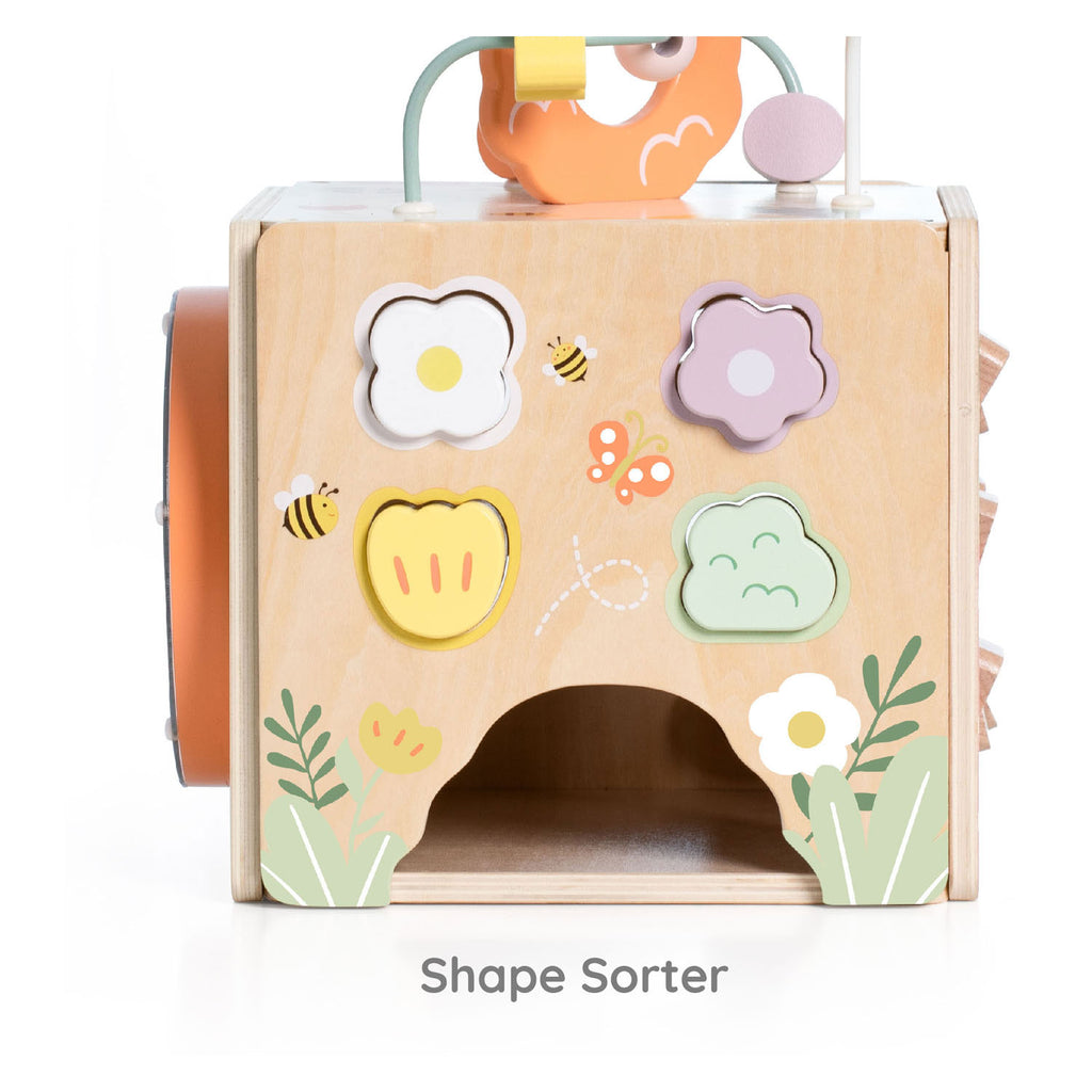 Het is een multifunctionele activiteitenkubus met een honingbijthema, inclusief een kralendoolhof, spinner, flip-nummerkaart, glijrails ensorteervormen. Kinderen zullen genieten van het verkennen van de wereld van de tuin. Het zal hun multisensorische vaardigheden helpen ontwikkelen.