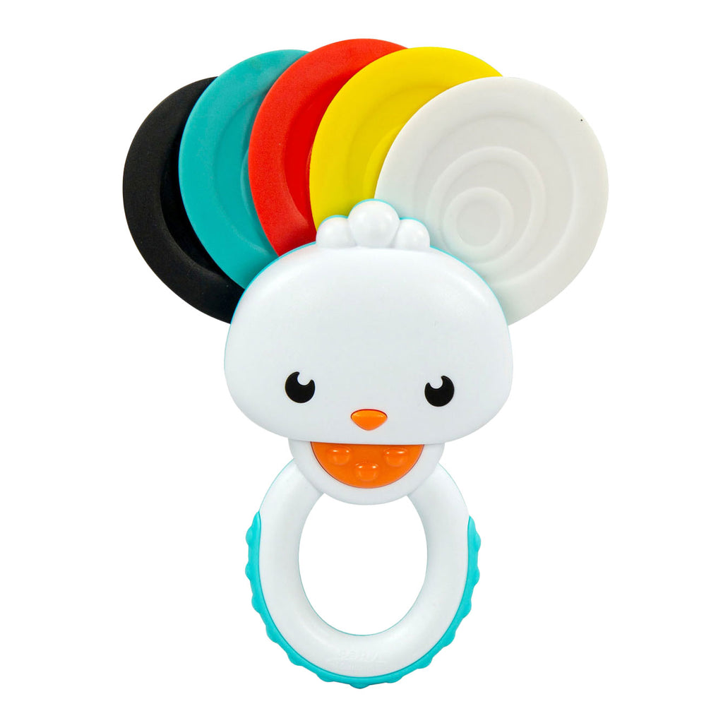 Een lieve, kleine pauwvormige rammelaar, ideaal voor het stimuleren van het zicht bij baby's tijdens hun eerste maanden. De zachte pauwstaart is geschikt voor de dentitiefase. De veren openen en sluiten met overlappende beweging om nieuwe kleuren te creëren. Beschik over een praktische ring en reliëftextuur om handmatige vaardigheden te stimuleren.