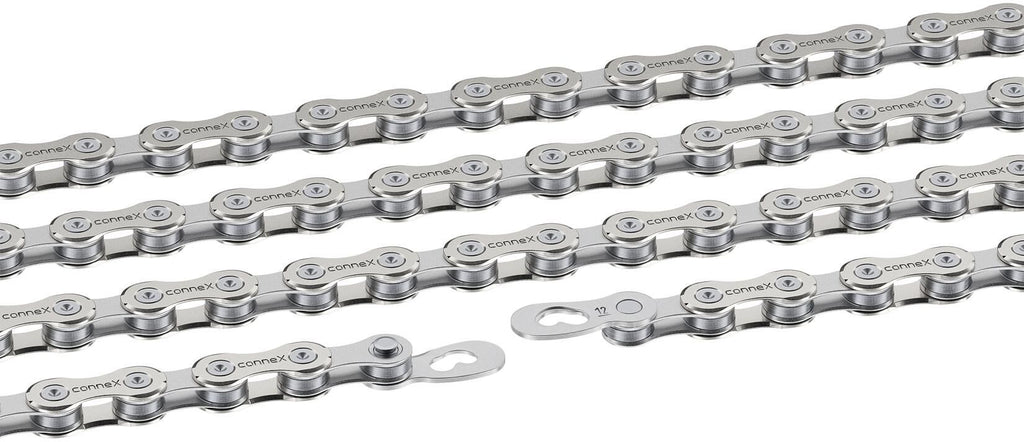 12-speed, 1/2" x 11/128 Presentatieverpakking, met een breedte van 2,10 mm zijn deze kettingen met alle standaard 12-speed schakelsystemen compatibel. Hoogwaardige materialen en de extreem vormgeving van de buitenschakel beloven hoge levensduur en uitstekende schakel-eigenschappen. Dankzij de bijgeleverde Connex verbindingsschakel kun je de fietsketting gemakkelijk monteren en verwijderen zonder gereedschap! Pin-lengte: 5,30 mm Aantal kettingschakels 126 st. Breedte inch 11/128 " Deling 1/2 Hoofdkleur zilver Incl. verbindingsschakel ja Systeemcompatibiliteit 12-speed Type/soort Artikel Type schakelsysteem derailleurversnelling