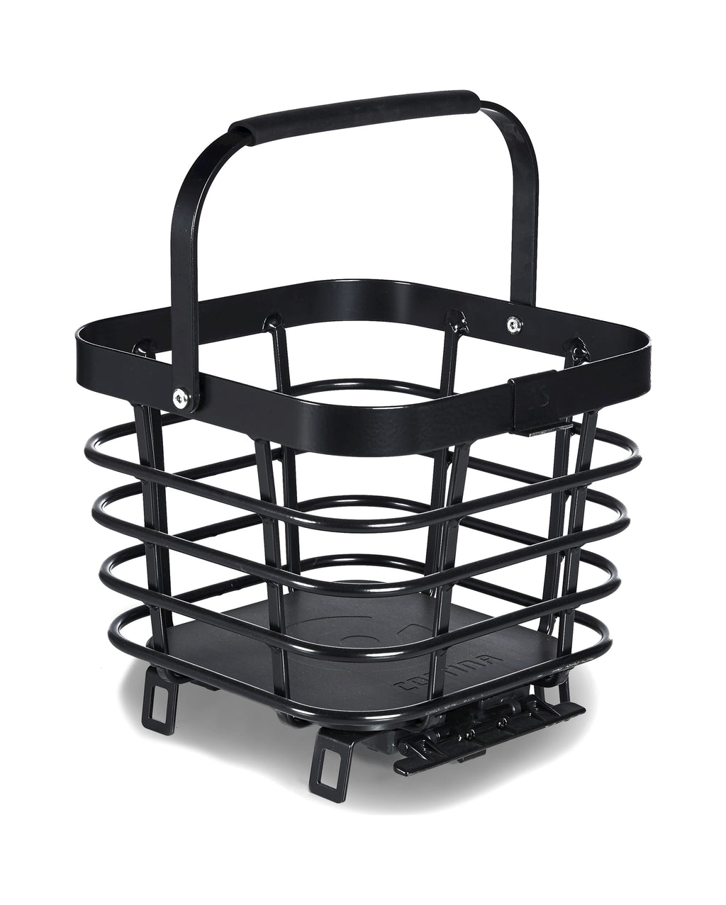 Mat zwarte vierkante mand met kliksysteem geschikt voor AtranVelo System (AVS) met platte softgrip handvat in mat zwart.