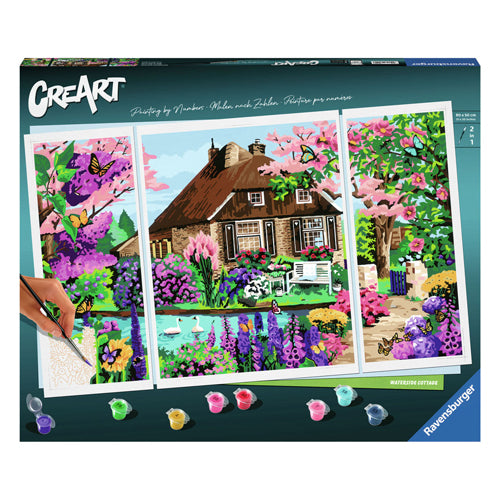 Schilder het kunstwerk CreArt Waterside Cottage! Schilderen op nummer van Ravensburger - iedereen kan schilderen! Dankzij de eenvoudige schildertechniek van schilderen op nummer is het kinderlijk eenvoudig de kunstenaar in jezelf wakker te maken! Dankzij de duidelijke schildervakjes ontstaan een klein en prachtig kunstwerk van 80,00 cm x 50,00 cm. De fijnere kleurnuanceringen zorgen voor een elegante kleurverloop en schaduwspel. Uitpakken en aan de slag, met de afbeelding van Waterside Cottage!