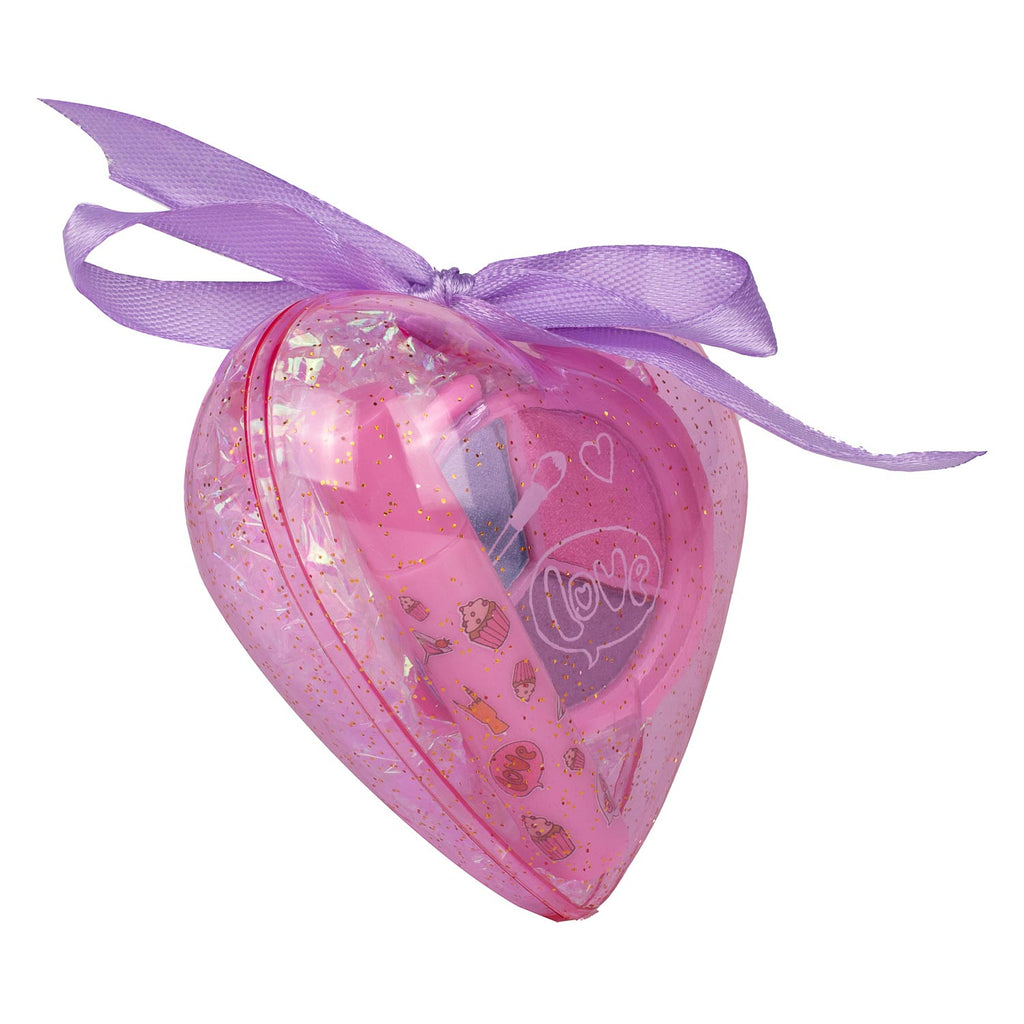 Een kunststof hartje van Create It! gevuld met twee stuks speelgoedmake-up voor kinderen. enige in drie setjes: 2 nagellakjes, oogschuw en mascara & 2 tinten lipgloss. Geschikt voor kinderen vanaf 6 jaar oud.