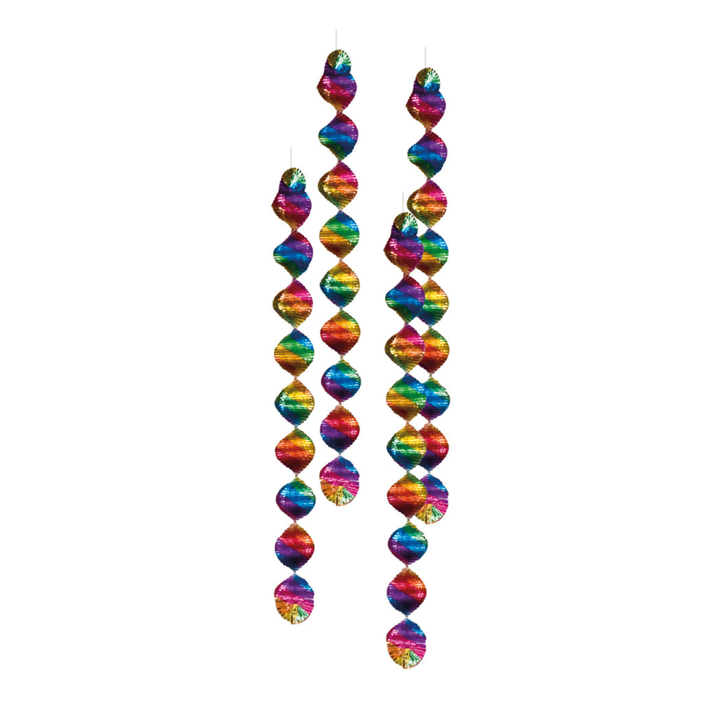 Maak feest jouw nog vrolijker met deze 4 decoratiespiralen. Je hangt ze op aan het touw en als ze draaien heeft dat een leuk effect, de regenboogkleuren draaien dan door elkaar heen. Zo wordt jouw feestje nog vrolijker.