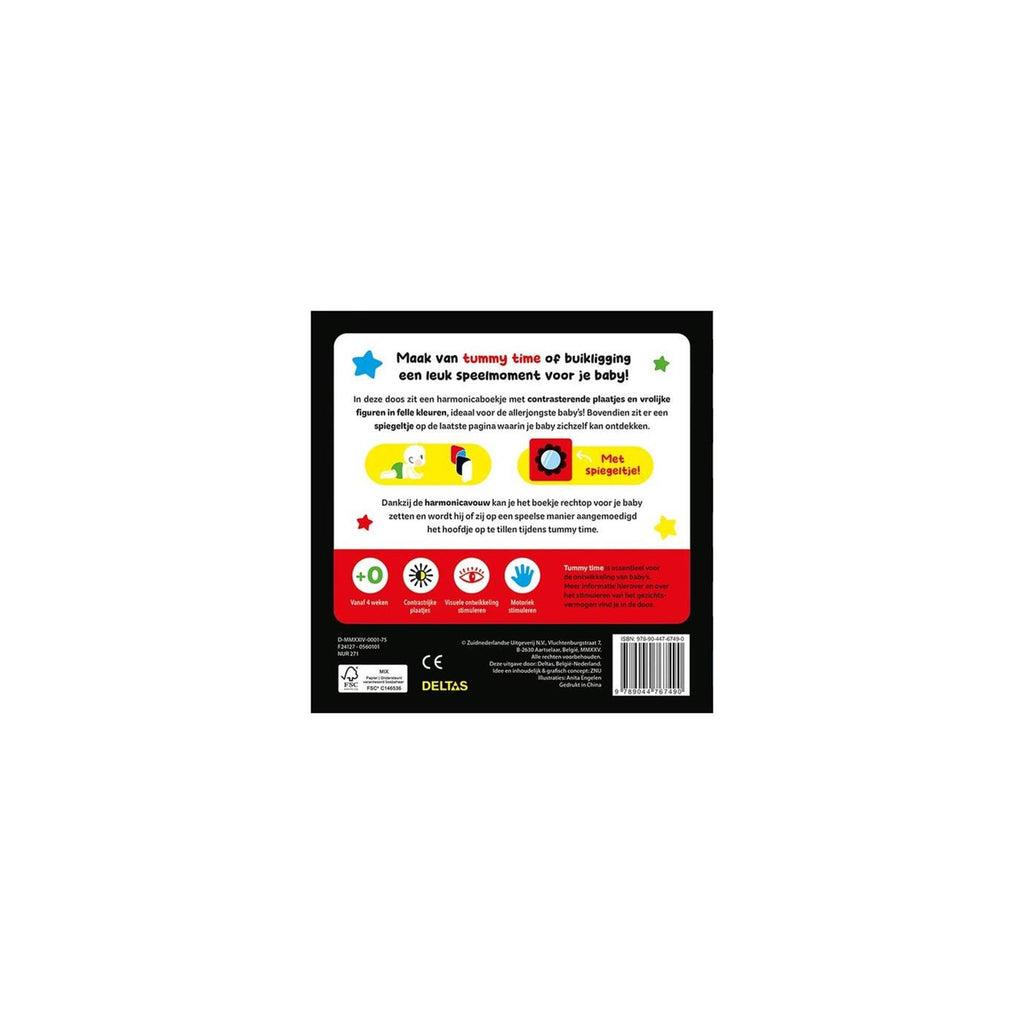 In deze prachtig vormgegeven doos zit een harmonicaboekje met contrasterende plaatjes en vrolijke figuren in felle kleuren, ideaal voor de allerjongste baby's! Dankzij de harmonicavouw kun je het boekje rechtop zetten tijdens 'tummy time'. Tummy time of buikligging is de oefening waarbij je baby op de buik ligt terwijl hij of zij wakker is. Door het boekje voor je baby neer te zetten, wordt hij of zij uitgedaagd om het hoofdje op te tillen en zichzelf met de armen omhoog te duwen. De zwart-witpatronen en kleurrijke plaatjes in het boekje zijn speciaal afgestemd op de visuele vaardigheden van jonge baby's. In de eerste maanden van het leven zien baby's namelijk nog niet scherp en kunnen ze alleen sterke contrasten, zoals zwart-wit, goed onderscheiden. Bovendien zit er een spiegeltje op de laatste pagina waarin je baby zichzelf kan ontdekken. Gebruik dit vrolijke harmonicaboekje om van tummy time een leuk speelmoment voor je baby te maken en stimuleer tegelijkertijd de ontwikkeling van zijn of haar gezichtsvermogen tijdens de cruciale eerste maanden. Met extra informatie over tummy time en het stimuleren van het gezichtsvermogen in de doos. Deltas – Hello Baby: Tummy Time is een speciaal ontworpen boek voor de allerkleinsten om te ontdekken tijdens de speeltijd op hun buikje. Het uitvouwbare, staande boek bevat contrastrijke zwart-witillustraties die de visuele ontwikkeling van baby’s stimuleren en hun aandacht vasthouden. Ideaal voor tummy time, een belangrijk moment voor het versterken van nek- en rugspieren. Gemaakt van stevig karton en veilig voor kleine handjes. Een perfect kraamcadeau en een waardevolle aanvulling voor babywinkels, boekhandels en conceptstores gericht op jonge gezinnen.
