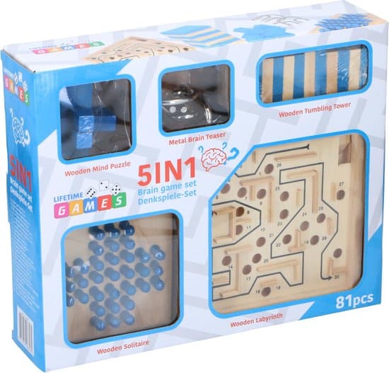 Houten Denkspellen 5in1, 81dlg. Geschikt voor kinderen vanaf 8 jaar. Denkspellen 5 in 1 set. Hersenspellen. Met solitair labyrint Yenga toren houten denkpuzzel en metalen denkpuzzel.