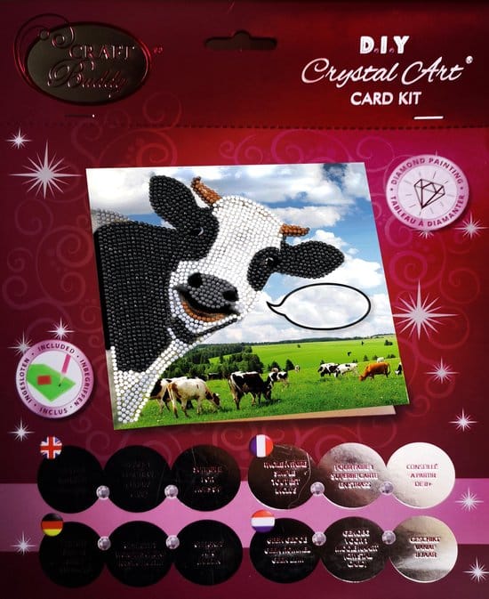 Diamond Painting - Kaart van een grappige koe. Deze Crystal Card Kit Funny Cow heeft de volgende inhoud: voorbedrukte kaart, enveloppe, voorgesorteerde elektrische steentjes in aparte zakjes, een werkpen, 1 blokje wax en een sorteerbakje. De kaart, met een afmeting van 18x18cm is voorbedrukt met speciale lijm. Volg de duidelijke instructies en maak zo zelf een prachtige kerstkaart. Plak eenvoudigweg met de meegeleverde werkpen en de was van de “diamantjes” op de kaart volgens de symbolenlijst. Het Crystal Card Kit patroon is veroorzaakt met een speciale lijm en voorzien van een warmere folie.Het is een zelfgemaakte mooie glinsterende wenskaart! Deze stevige kaart van mooie kwaliteit kan direct worden aangestuurd in de bijgeleverde envelop.