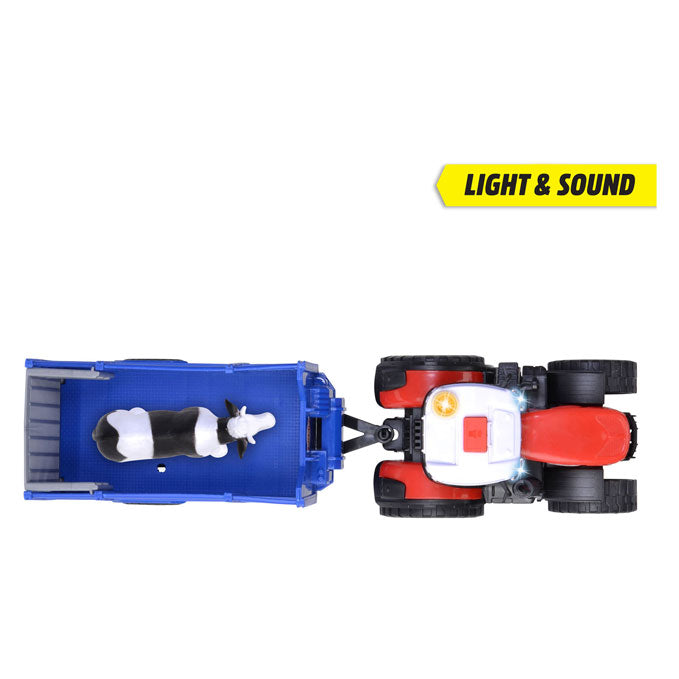 Deze 26 cm lange Massey Ferguson tractor- en aanhangerset is het ultieme speelgoed voor jonge boeren in de dop. De aanhangwagen is speciaal ontworpen voor het vervoer van dieren en een kleine neerklapbare oprijplaat aan de achterzijde voor het laden en oplossen. Officieel gelicentieerd voertuig van Massey Ferguson De tractor is officieel gelicentieerd door Massey Ferguson en ontworpen op basis van het originele voertuig. Het beschikt ook over draaiende wielen voor gelijktijdige wendbaarheid, vergelijkbare gelijke licht- en geluidseffecten - perfect voor fantasiespel met boerderijthema! Speelgoedtractor met accessoires De set bevat ook een zwart-witte koefiguur, die op de dierenaanhanger kan worden vervoerd. Ontworpen voor kinderen van 3 jaar en ouder, wordt geleverd met 2x 1,5 V AAA-batterijen en is een geweldige aanvulling op elke speelgoedboerderij.