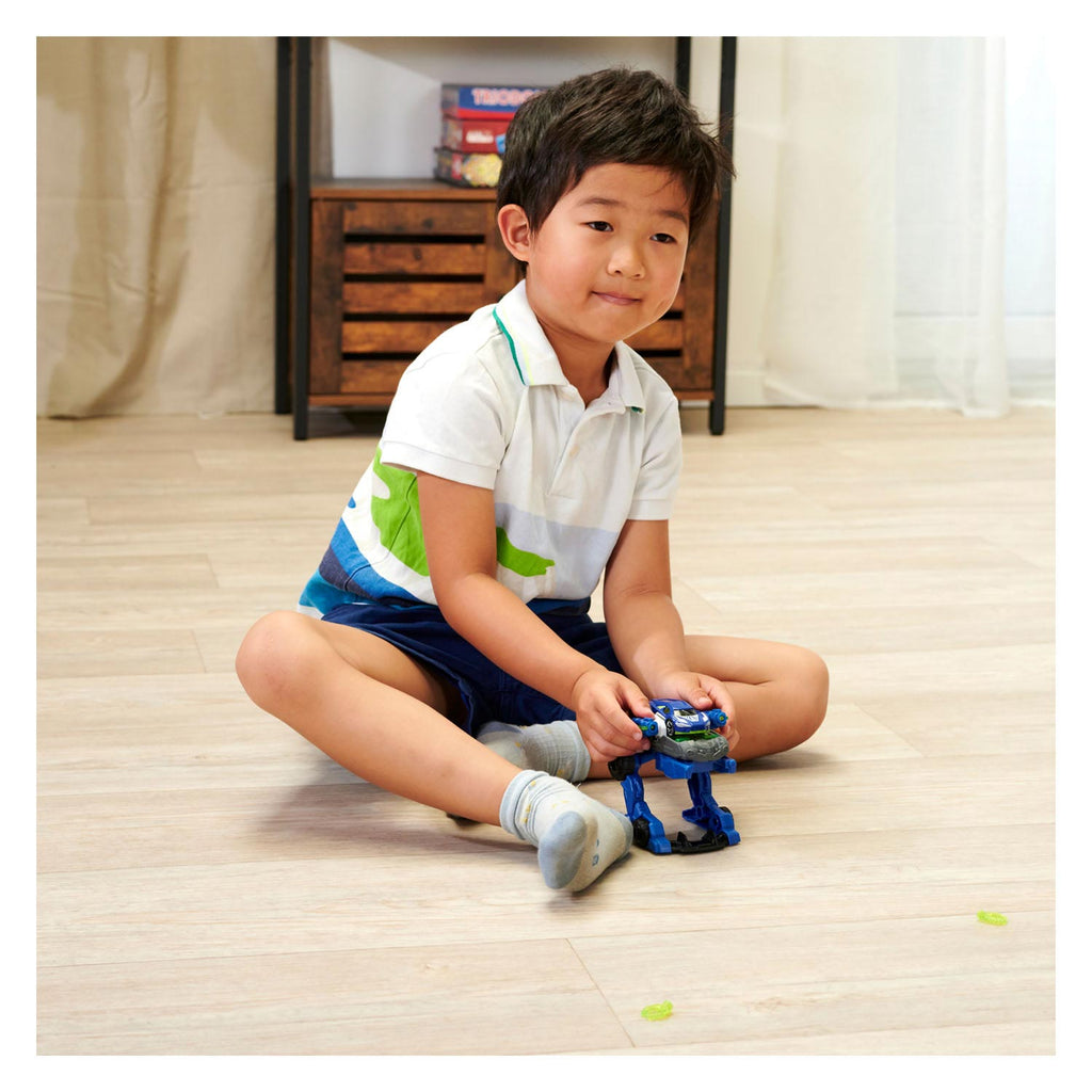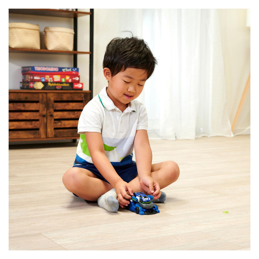 Deze politieauto is een transformerrobot met een schietfunctie. De auto kan ook losgeklikt worden van de robot.