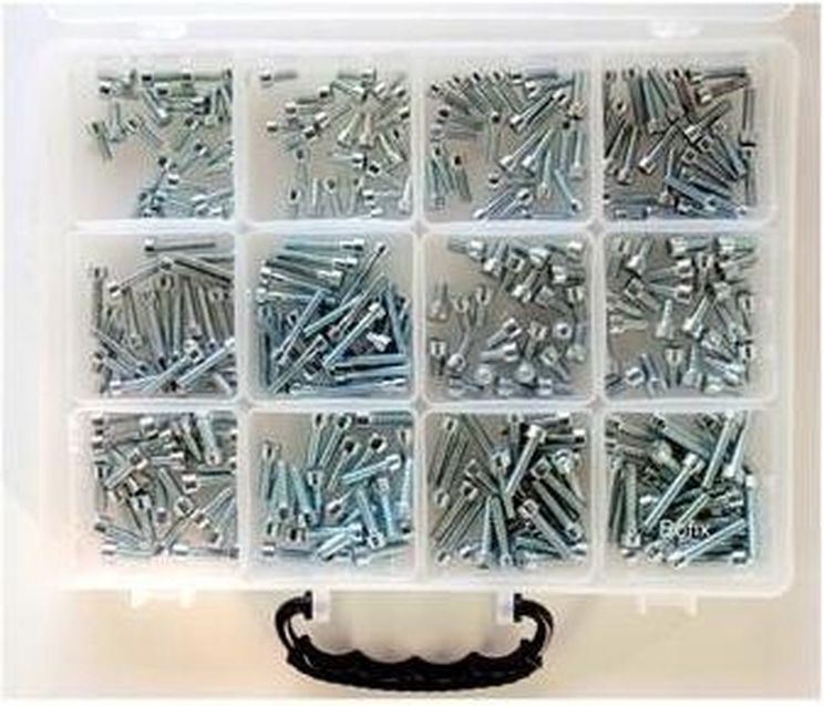 Bofix 214299 is een assortiment van 12 vaks inbusbouten van roestvrij staal.