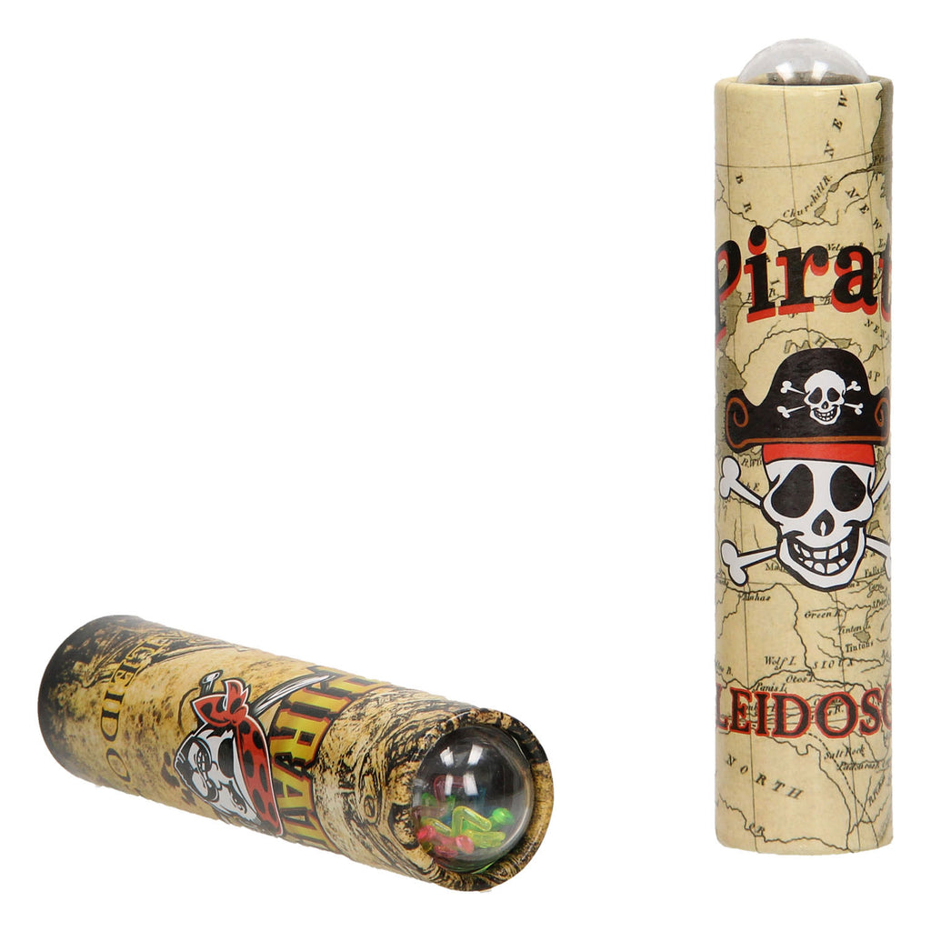 Houd de piraten caleidoscoop tegen het licht, kijk er doorheen en draai de caleidoscoop rond. Zie hoe de vormen en kleuren veranderen.
