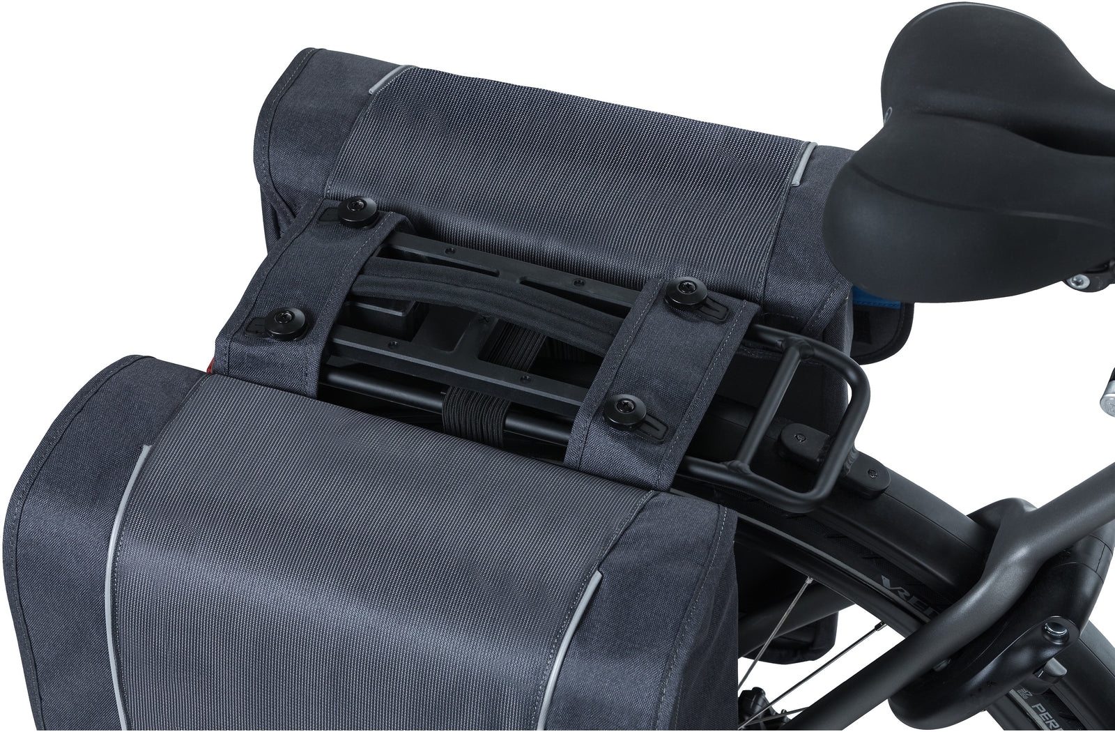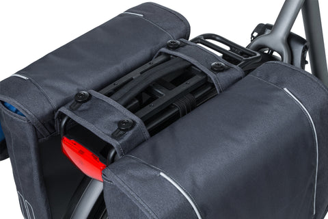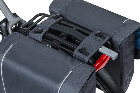 De Basil Sport Design Dubbele tas MIK is een moderne dubbele fietstas gemaakt van hoogwaardig en waterafstotend polyester. Deze tas heeft een mooie blauwe binnenvoering en een goede doordachte indeling, inclusief elastische flessenbanden. De fietstas wordt geleverd met een voorgemonteerde MIK-adapterplaat, waardoor je de tas eenvoudig kunt bevestigen op een MIK systeemdrager of MIK Carrierplaat (apart verkrijgbaar). De tas heeft reflectie op alle zijden voor een betere zichtbaarheid in het donker. Het aansnoerkoord en de kliksluiting zorgen voor een goede afsluiting. Afmetingen: 35 cm x 15 cm x 43 cm (Buitenwerkse maten) Model: Achtertas Dubbel of enkel: Dubbel Geschikt voor: Elektrische fiets, stadsfiets, city-trekkingfiets, damesfiets, herenfiets, unisex Activiteit: Woon/werk, Recreatief MIK Adapterplaat 70171 (inclusief) De Basil Sport Design MIK dubbele fietstas is een model met een inhoud van 32 liter. De tas is eenvoudigweg te bevestigen met het MIK-systeem en geschikt voor diverse bagagedragers op elektrische fietsen en stadsfietsen. De tas heeft handige eigenschappen zoals reflectie en waterafstotend materiaal. Daarnaast is de tas voorzien van een elastische flessenband en biedt het MIK-systeem gebruik. De fietstas is geschikt voor diverse bagagedragers en kan gebruikt worden in verschillende weersomstandigheden. De tas heeft slanke opbergmogelijkheden, waaronder een extra optie voor het opbergen van een drinkfles. Het totale draagvermogen van de tas is 10 kg, met een maximum van 5 kg per enkele tas.