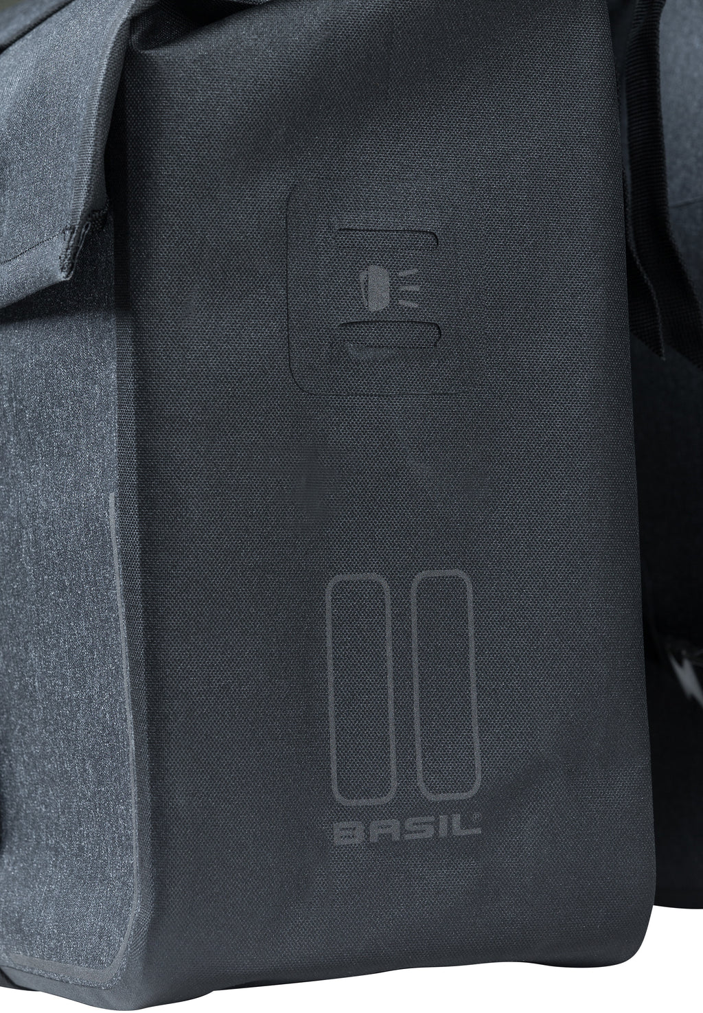 De Basil Urban Dry is een dubbele fietstas gemaakt van waterdicht materiaal. Met een inhoud van 50 liter is er genoeg ruimte voor boodschappen of andere spullen tijdens het fietsen. De tas is 100% waterdicht en voldoet aan de hoge IPX 3-norm. De praktische vouwsluiting zorgt ervoor dat de tas goed afgesloten kan worden. De tas is voorzien van veganistische lederen details en reflecterende details voor een betere zichtbaarheid in het verkeer. Bevestiging aan de bagagedrager van de fiets is eenvoudig met het Basil Universal Bridge systeem. Productspecificaties - Inhoud: 50 liter - Materiaal: Polyester - Kleur: Grijs - Systeem: Basil Universal Bridge systeem - Diefstalbeveiliging: Nee - Waterbestendig: Waterdicht - Afmetingen: 36 x 17 x 42 cm (Buitenwerkse maten) - Draagcapaciteit: 10 kg totaal, met een maximum van 5 kg per tas - Garantie: 2 jaar