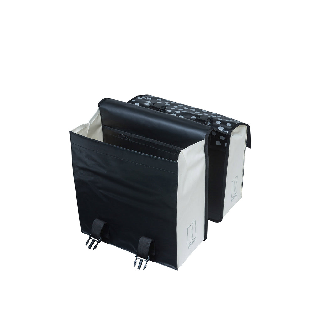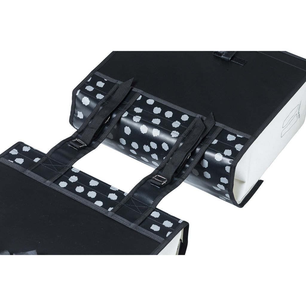 De Basil Urban Load fietstas is een stijlvolle en praktische dubbele fietstas. Met zijn vrouwelijke stippenpatroon en waterafstotende materiaal is deze tas perfect voor dagelijkse fietstochten in de stad. De ruime inhoud van 53 liter biedt voldoende ruimte voor al je spullen, of het nu boodschappen, kleding of andere benodigdheden zijn. De vouwsluiting zorgt ervoor dat je spullen droog blijven, zelfs tijdens een regenbui. De flexibele kosten maken de tas compacter wanneer hij leeg is, waardoor je gemakkelijk je fiets kunt stallen. De Basil Urban Load fietstas is geschikt voor alle bagagedragers, inclusief e-bikes, dankzij het Basil Universal Bridge System. Bovendien zorgen de reflectiestippen en -details ervoor dat je beter zichtbaar bent in het verkeer. Product specificaties - Afmetingen: 41 x 18 x 46 cm (Buitenwerkse maten) - Volume: 48 l - Model: Achtertas - Dubbel of enkel: Dubbel - Geschikt voor: Elektrische fiets, stadsfiets, city-trekking fiets - Materiaal: Polyester, waterafstotend dekzeil - Vouwsluiting voorkomt inregenen - Flexibele conventionele voor compactere vorm - Flexibele kliksluitingen voor geen - Reflectiestippen en -details voor betere - Basil Universal Bridge System voor veilige met diverse bagagedragers - Inhoud: 53 liter - Kleuren: Groen met wit, grijs met (goud)geel, zwart met lichte reflecterende stippen