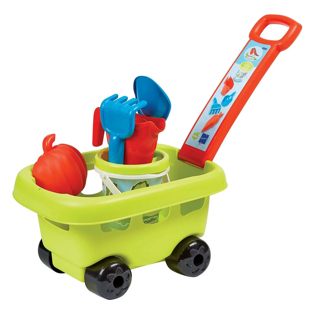 Ecoiffier bolderkar met verschillende accessoires voor de tuin of voor in de zandbak. Inhoud: bolderkar, gieter, emmer, harkje, schep en een plantenpotje.