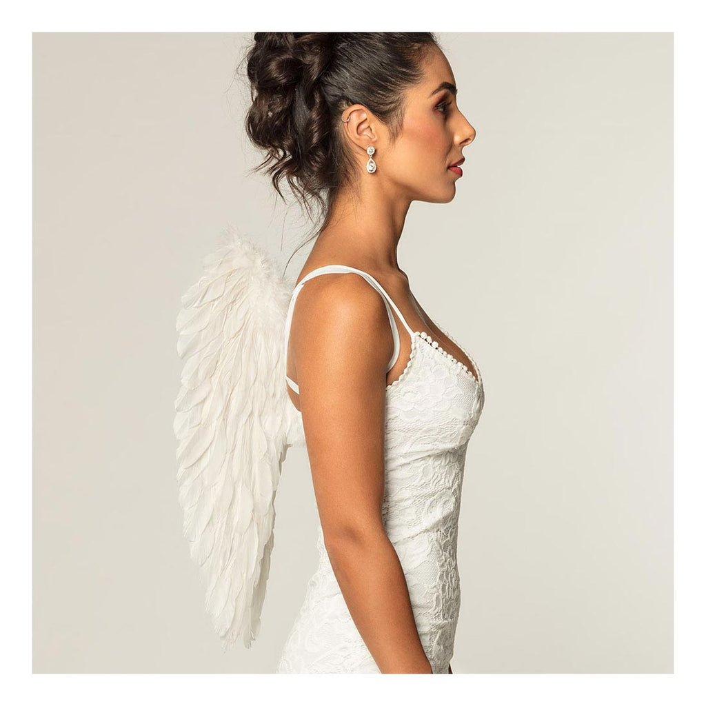 Witte engelenvleugels met veren en handige tuigjes om ze te doen.