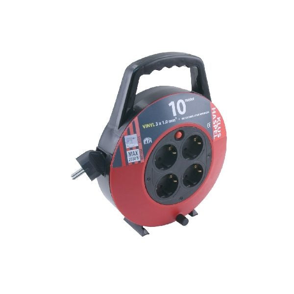 Klus Kabelhaspel voor Binnen 10 Meter. Max. 2300 Watt, maximaal 750 Watt opgerold. Vinyl kabel. Met overbelastingbeveiliging.