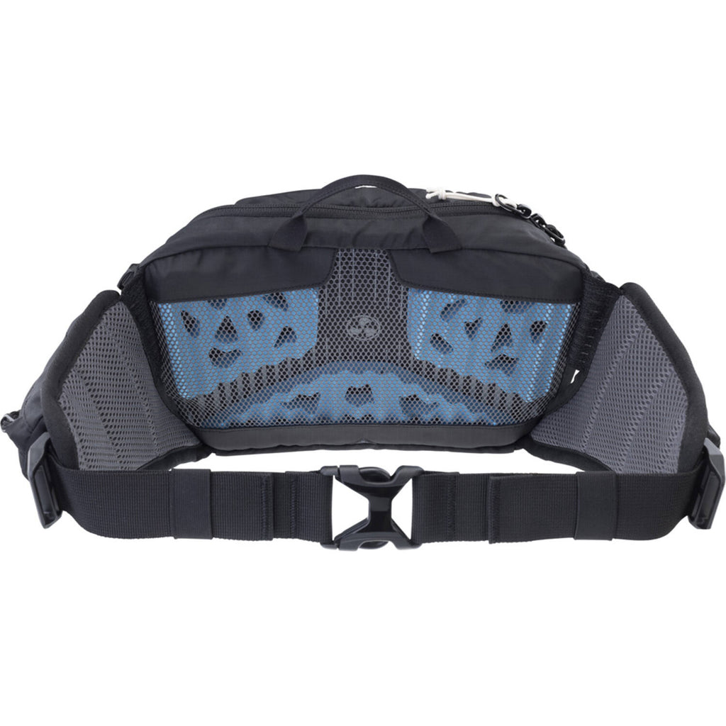 HIP PACK 3 – Zwart De HIP PACK 3 met AIR FLOW CONTACT SYSTEM is ontworpen voor fietstochten met minimale uitrusting. Dankzij het VENTI FLAP System kun je de afstand tot je rug aanpassen en zo de ventilatie personaliseren. Dit zorgt voor maximale luchtcirculatie en een stabiele pasvorm. De heuptas biedt ruimte voor een drinkreservoir tot 1,5 L en is voorzien van een pull‑forward systeem voor eenvoudige lengte‑aanpassing van de heupriem. Specificaties • Gewicht: 470 g • Afmetingen: 28 × 18 × 8 cm •
