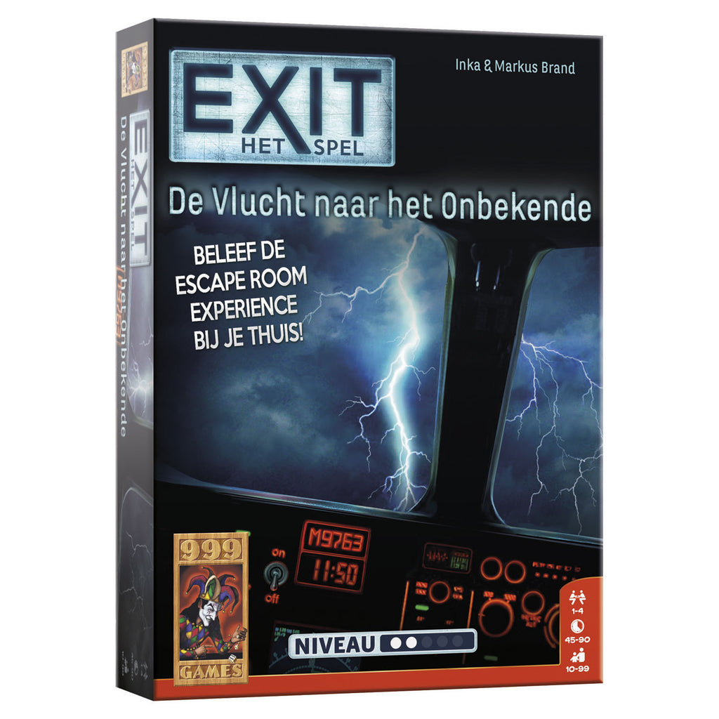 Als deel van de bemanning van een passagiersvliegtuig slaat de schrik om het hart als jullie worden overvallen door noodweer. De wind schudt het vliegtuig heen en weer, water stroomt naar binnen en alle systemen beginnen te falen. Het wordt een race tegen de klok om het vliegtuig op tijd weer aan de praat te krijgen. Probeer binnen anderhalf uur alle puzzels op te lossen en alle codes te breken. Alleen dan lukt het jullie om de storm te overleven en het vliegtuig weer veilig te laten landen. Logisch nadenken en doorzettingsvermogen zijn vereist om dit spel tot een goed einde te brengen. En komen jullie er echt niet uit, dan bevat het spel tipkaarten om jullie op het goede spoor te brengen. EXIT: De vlucht naar het onbekende is maar één keer speelbaar omdat het speelmateriaal moet worden beschreven, gevouwen of afgescheurd. Maar net als in een “echte” escape room hebben we een unieke puzzel- en speelervaring! De vlucht naar het onbekende is niet een niet te al te hoge moeilijkheidsgraad en is dus uitermate geschikt voor beginners en ontspannen puzzelaars.