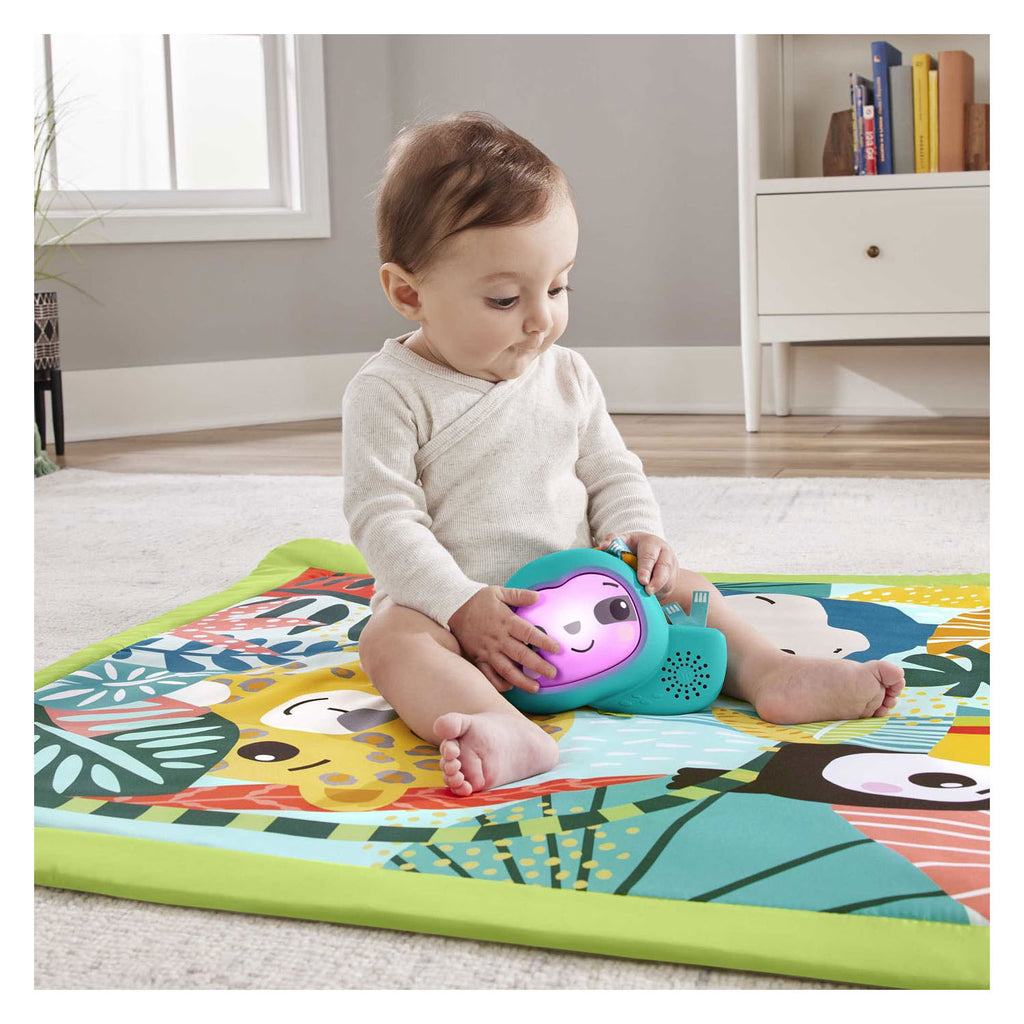 De Fisher-Price 3-in-1 Regenwoud Babygym groeit met je baby mee, van baby tot peuter, en geeft je baby een leuke manier om zijn zintuigen te ontwikkelen. Inclusief baby's kunnen op de zachte speelmat liggen met 6 speeltjes die aan de bogen boven ze hangen. De verstelbare boog kan naar beneden worden geschoven, zodat de speeltjes binnen handbereik voor je baby liggen, terwijl de buikligtrainer met giraffe je baby helpt terwijl hij speelt. Ook het luiaardspeeltje met lichtjes en geluidjes houdt van het speelkwartier van je baby spannend als hij van buik- naar zitpositie gaat en later integreert gaat zetten.