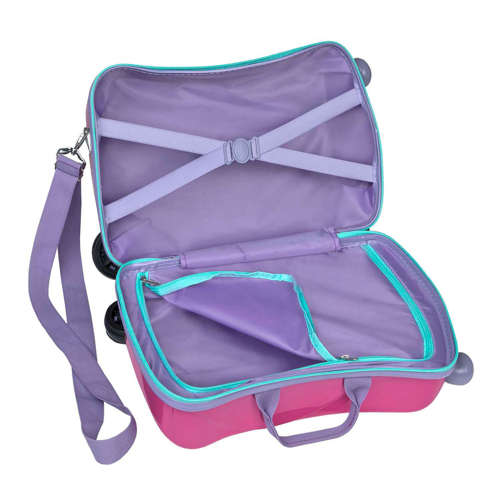 Stoere Gabby's Dollhouse ride-on trolley: superhandig voor op reis! Op deze koffer kan het soort zijn tijdens de reis lekker zitten en meerijden met de rest van het gezelschap. Met praktische handvatten, schouderbanden, 4 wielen, 1 vak met spanriem en een vak met rits. Afmetingen: 47,5 x 23 x 32 cm. Kleur: roze/paars. Gabby's Poppenhuis Ride-On Trolleykoffer met zitfunctie voor kinderen. De roze koffer is extra stevig en heeft zowel een handvat als schouder-/trekriem. Binnen vind je twee compartimenten, een met elastiek en een met afsluitbare rits. Maximaal aanbevolen draagvermogen: 50 kg. Afmetingen: 41,5 x 21 x 31 centimeter.