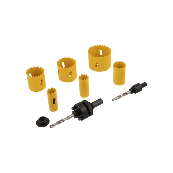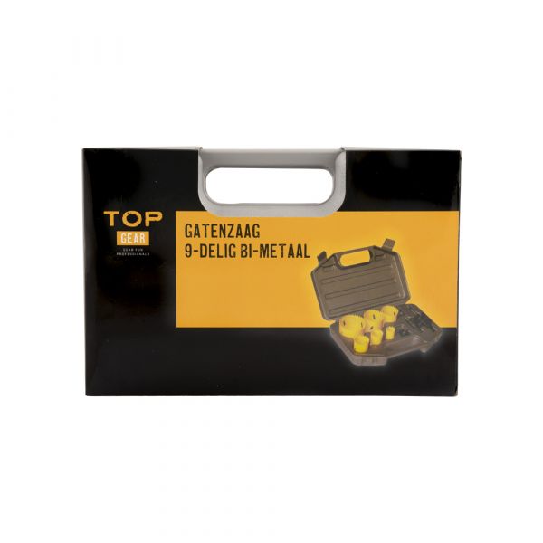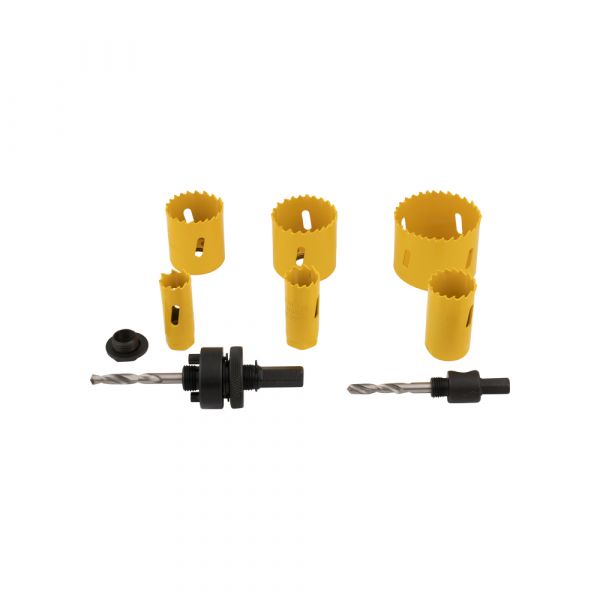 Gatenzaag 9 delig bi-metaal Gatenzaagset van goede kwaliteit. Bestaande uit 6 gatenzagen in de maten: 19, 22, 29, 38, 44 en 57 mm. van HSS kwaliteit. Compleet met 2 boorkoppen en pasring. Verpakt in stevige doos.