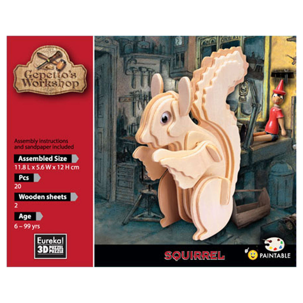 Een bouwpakket van een houten eekhoorn met 20 onderdelen. Het formaat van de eekhoorn is 11,8 x 5,6 x 12 cm. Het bouwpakket wordt geleverd inclusief instructie.
