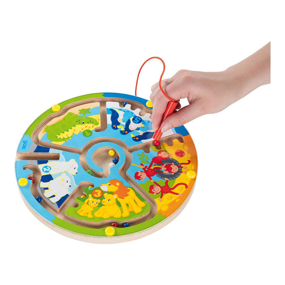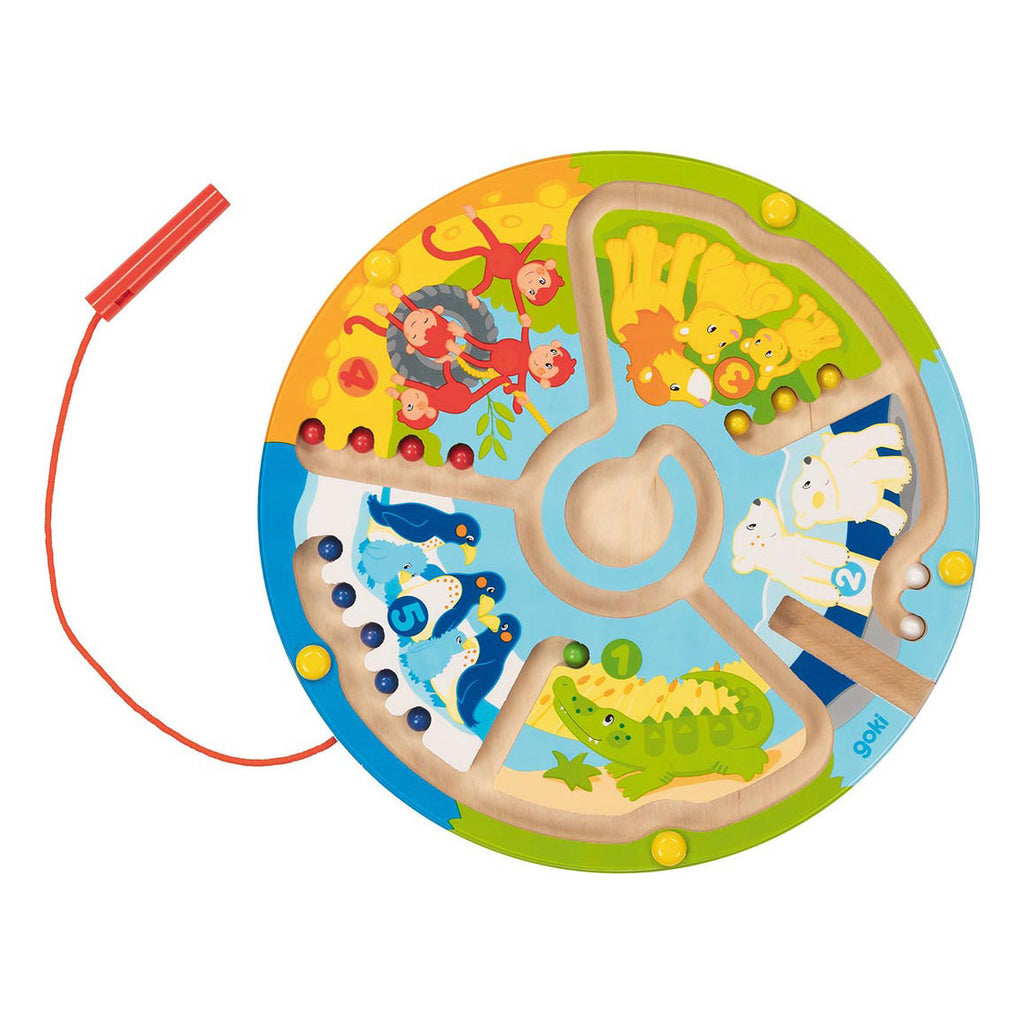 Het perfecte magnetische doolhof van Goki. Het liefdevol uitgevoerde dierentuinthema geeft het leerzame spel een emotionele kant, wat belangrijk is voor langdurige prikkels om te spelen. De motorische vaardigheden worden verbeterd. De kleine, elektrische, metalen balletjes plaatsen je met de magnetische stok. De wegen naar de velden zijn ontworpen om te dienen als een eerste oefening met het schrijven. Conclusie: 100% speelplezier, 100% leereffect - volledig stressvrij. Afmeting: 1,5 centimeter hoog, diameter.. centimeter. Materiaal: hout, kunststof. Geschikt voor kinderen vanaf 3 jaar oud.