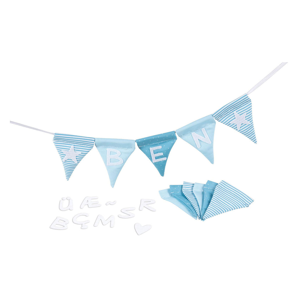 Of het nu voor een verjaardag is, een eerste schooldag of om de deur van een kinderkamer te maat - deze blauwe vlaggenlijn is een zeer persoonlijk cadeau voor elke gelegenheid. Tien stoffen wimpels in 3 kleuren blauw met 4 stickervellen nodigen kinderen uit om ze op te plakken en hun eigen ontwerp te creëren. Zoals hun eigen naam, versierd met hartjes en sterren. Afmeting: 7,5 bij 10 cm. Materiaal: stof. Geschikt voor kinderen vanaf 3 jaar oud.