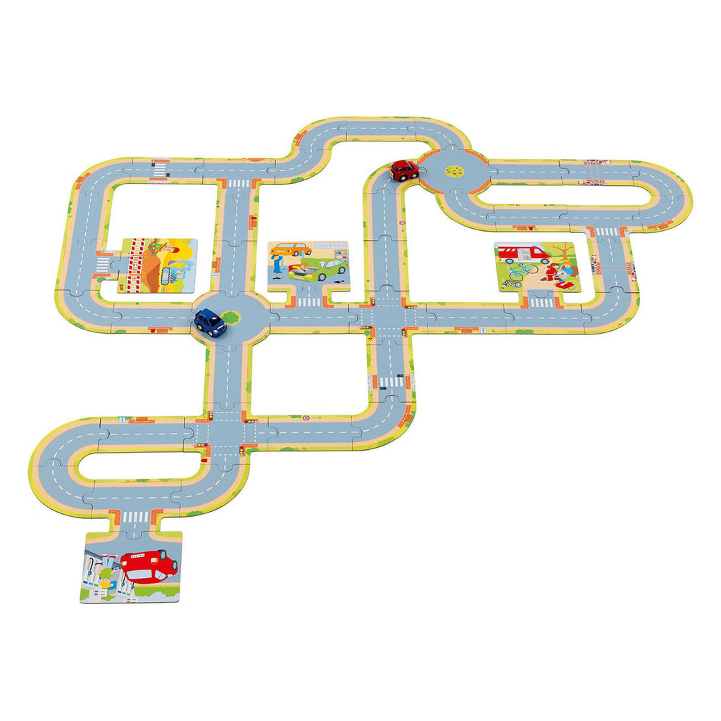 Bouw je eigen circuit met deze componenten straten van Goki. De set bestaat uit 45 delen die je gemakkelijk aan elkaar zet voordat je een eigen baan hebt gemaakt. Het circuit bestaat uit bochten, kruispunten, rotondes, parkeerplekken en rechte stukken. Naast de wegdelen zitten er ook 2 metalen auto's bij de set. Geschikt voor kinderen vanaf 3 jaar.