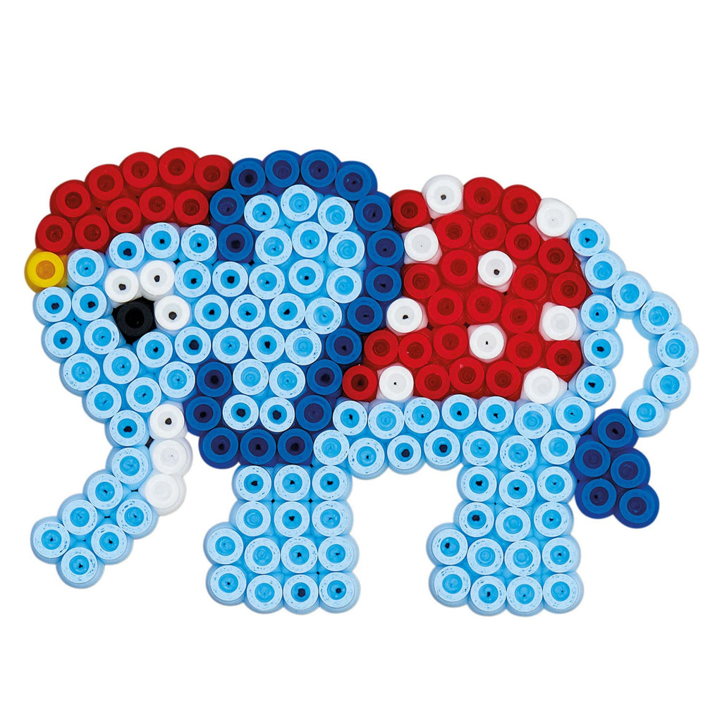 Een pot met 15000 Hama strijkkralen in verschillende kleuren. Deze set wordt compleet geleverd met 3 verschillende strijkkralenbordjes in de vorm van een vierkant, een dinosaurus en een olifant.