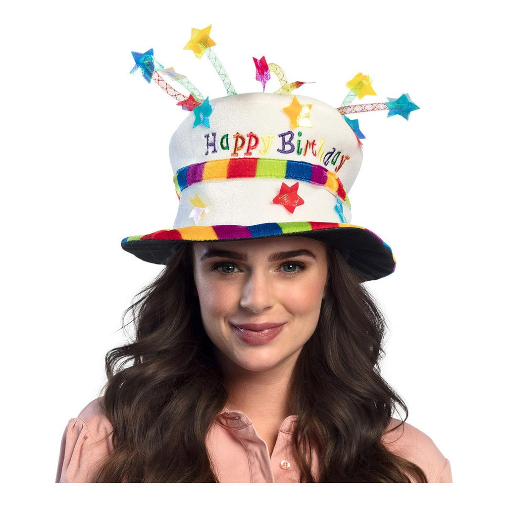 Maak de verjaardag van de jarige extra speciaal met deze vrolijke elektrische hoed. De hoed is versierd met de tekst 'Happy Birthday' en heeft de vorm van een verjaardagstaart. De flexibele glinsterende kaarsjes op de bovenzijde zorgen voor een feestelijke uitstraling.