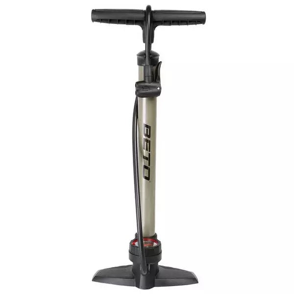 De Beto Hoge Druk fietspomp is een stalen vloerpomp met een donkerzilveren kleur. Deze pomp is uitgerust met een manometer aan de onderkant, waardoor je de druk nauwkeurig kunt aflezen. Met het universele dubbele pompkopstuk kun je gemakkelijk Frans, Dunlop en autoventielen bedienen. De blije zuiger in de cilinder zorgt voor veel vermogen per slag, waardoor je snel en efficiënt kunt pompen. Laat op dat de ventielen niet bij de pomp worden geleverd, maar op de banden zelf zitten. Productspecificaties: - Afmeting: 38 mm x 47 cm - Materiaal: staal, kunststof - Kleur: Titanium / Grijs - Druk: tot ca. 7-8 bar / 100-120 PSI - Frans ventiel - Dunlop ventiel - Auto ventiel