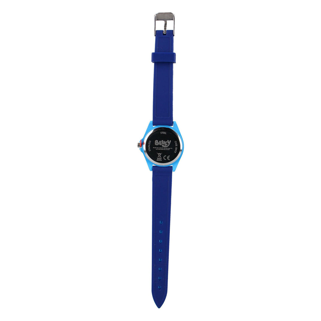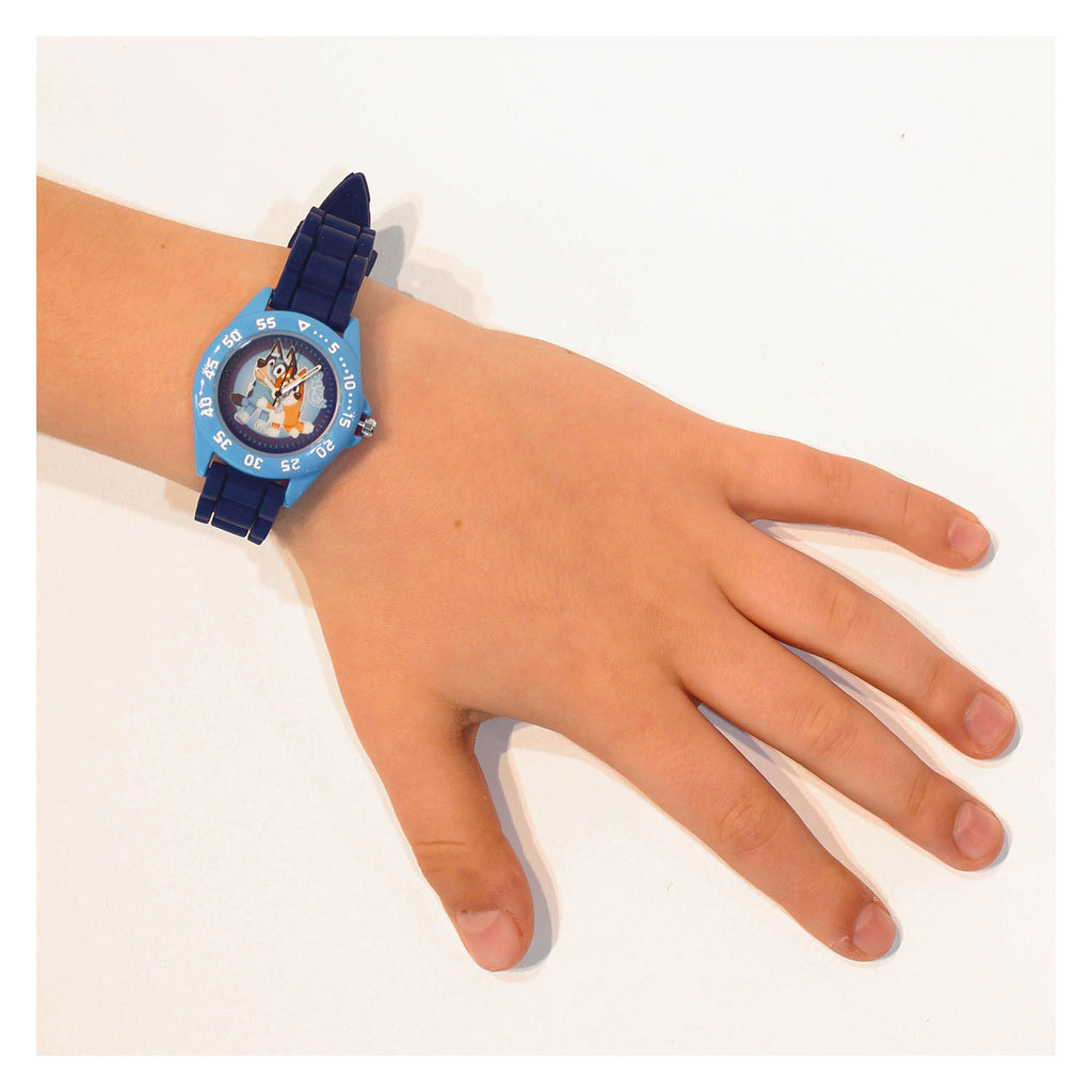 Met dit leuke Bluey horloge uit de Kids Time! collectie kan ieder soort supersnel de tijd lezen en bevatten zijn of haar favoriete figuur om de pols dragen. Zo komt een soort nooit meer te laat op school of bij de sportles. Dit blauwe horloge is voorzien van een PVC polsband en heeft een wijzerplaat met daarop Bluey en haar zus Bingo, hoofdpersonages uit de populaire serie, afgebeeld. De grote en kleine wijzers zijn geel van kleur. Voor elke pols is dit horloge op maat te maken, omdat de RVC gespsluiting strakker en losser te maken is. Het horloge is spatwaterdicht en heeft een garantie van 2 jaar. Het Bluey horloge wordt geleverd in een mooi, op maat gemaakt doosje zodat het horloge niet beschadigd is.