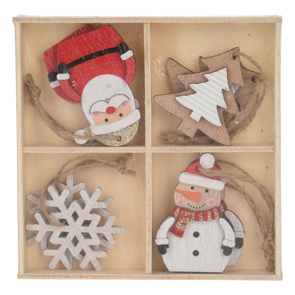 Achtdelige set met houten kerstboomhangers, oa in vormen van sneeuwpoppen, rendieren, sneeuwvlokken en dennenbomen. In elke set zitten 8 houten kersthangers (4 x 2 stuks).