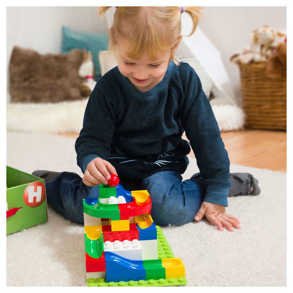 Zoef! Daar gaat jouw knikker! Gaat hij in een keer naar beneden? Bouw jij de mooiste en hoogste knikkerbanen? Met deze miniset van Hubelino bouw jij de mooiste constructies, dit komt door de steile hellingen, scherpe bochten en tunnels. Gebruik je eigen fantasie en creativiteit om de leukste knikkerbanen te maken, of gebruik de voorbeelden uit de Hubelino App. Er zijn heel veel mogelijkheden voor de meest gegeven banen, ook omdat je de Hubelino knikkerbaan kunt combineren met jouw eigen bouwblokjes. In deze miniset van Hubelino zit alles voor uren speel-, bouw- en knikkerplezier! De knikkerbanen en bouwblokken zijn gemaakt van kwalitatieve en duurzame kunststof, waardoor je er langer plezier van! Deze kleine set kun je los gebruiken, maar is ook een goede aanvulling op de start- en basisset. Dan maak je nog grotere en mooiere knikkerbanen! In deze set zit alles wat je nodig hebt om te beginnen: -2 Grote bochten (180º) -6 Hoekelementen -2 Grote hellingen -3 Kleine hellingen -2 Kleine baanonderdelen (4 noppen) -2 Lange baanonderdeel (8 noppen) -2 Tunnels -21 Bouwstenen in verschillende maten -2 Stop/start blokjes -1 Grondplaat/basis (140 noppen) -2 Knikkers -1 Gebruiksaanwijzing