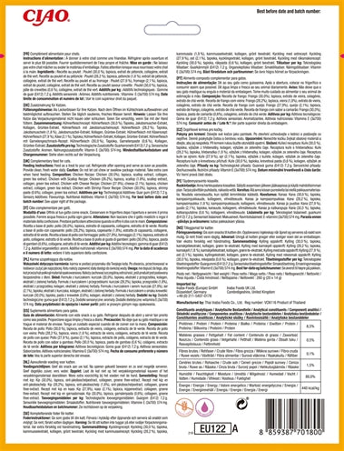 Analytische ingrediënten: Ruw eiwit (min) 7%, ruw vet (min) 0,2%, ruwe vezels (max) 0,3%, vocht (max) 91%, Vitamine E (min) 310 IE/kg, taurine (min) 0,025%
