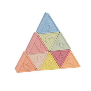 Set van 9 zachte blokken van Jipy, gemaakt van bioplastic. Verpakt in driehoekige doos. Geschikt vanaf 6 maanden. Assorti kleuren.
