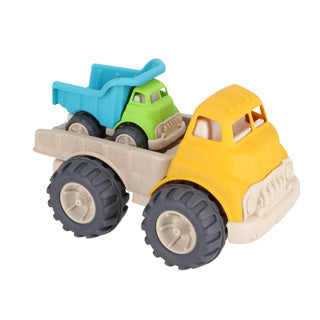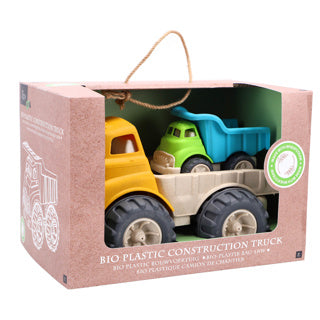 Bouwvoertuigenset bioplastic. Twee bouwvoertuigen van duurzaam bioplastic. Een grote kiepwagen die de kleinere kiepwagen kan vervoeren. De grote wagen is ca. 30 cm lang en 20 cm hoog, de kleinere wagen ca. 20 bij 15cm. Geschikt voor kinderen vanaf 18 maanden.