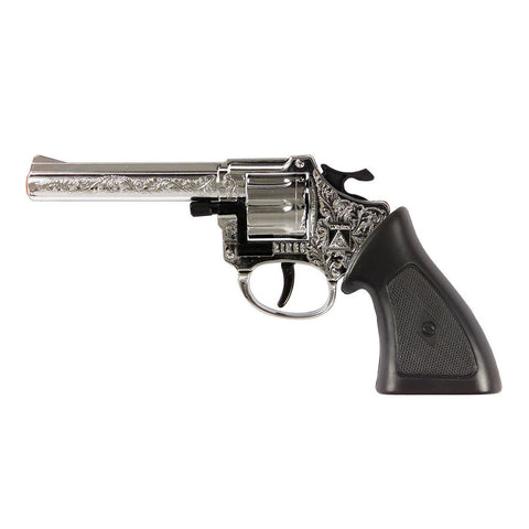 Dit klappertjespistool is 16 cm lang en is gemaakt van kunststof. Dit speelgoedgeweer maakt een cowboyoutfit compleet en staat garant voor uren speelplezier. De klappertjes revolver kan per rondje 8 schoten afvuren. Klappertjes niet aanmelden, te bestellen onder artikelnummer 4699769.
