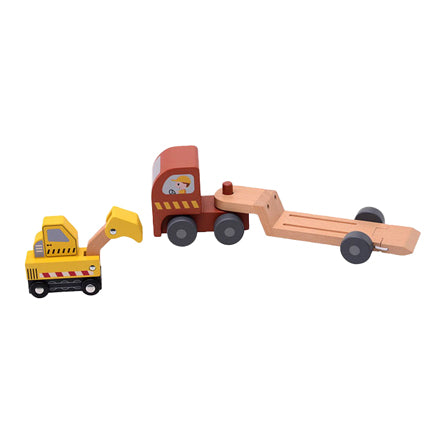 Jouéco oplegger met graafmachine. Gemaakt van hout. Geschikt voor kinderen vanaf 18 maanden.