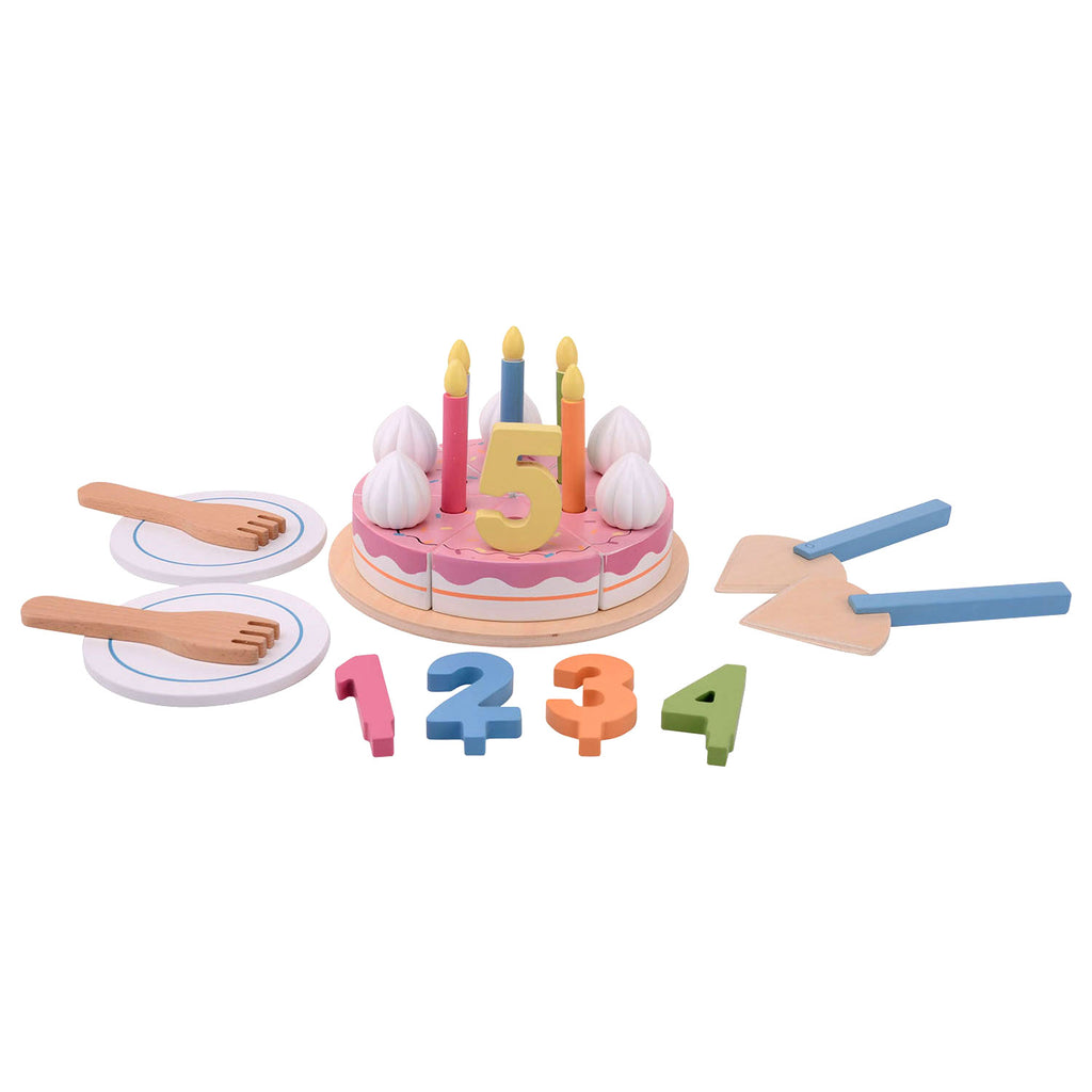De Joueco verjaardagstaart speelset is perfect voor kinderen van 3 tot 5 jaar oud. De set bevat een voorgesneden taart, 5 kaarsjes, 5 getallen (1 t/m 5), 2 bordjes, 2 vorkjes en 2 taartschepjes. Alle onderdelen zijn gemaakt van hout, waardoor ze duurzaam en veilig zijn voor kinderen om mee te spelen. Met deze speelset kunnen kinderen hun eigen verjaardagsfeestje naspelen en hun creativiteit en verbeeldingskracht stimuleren.