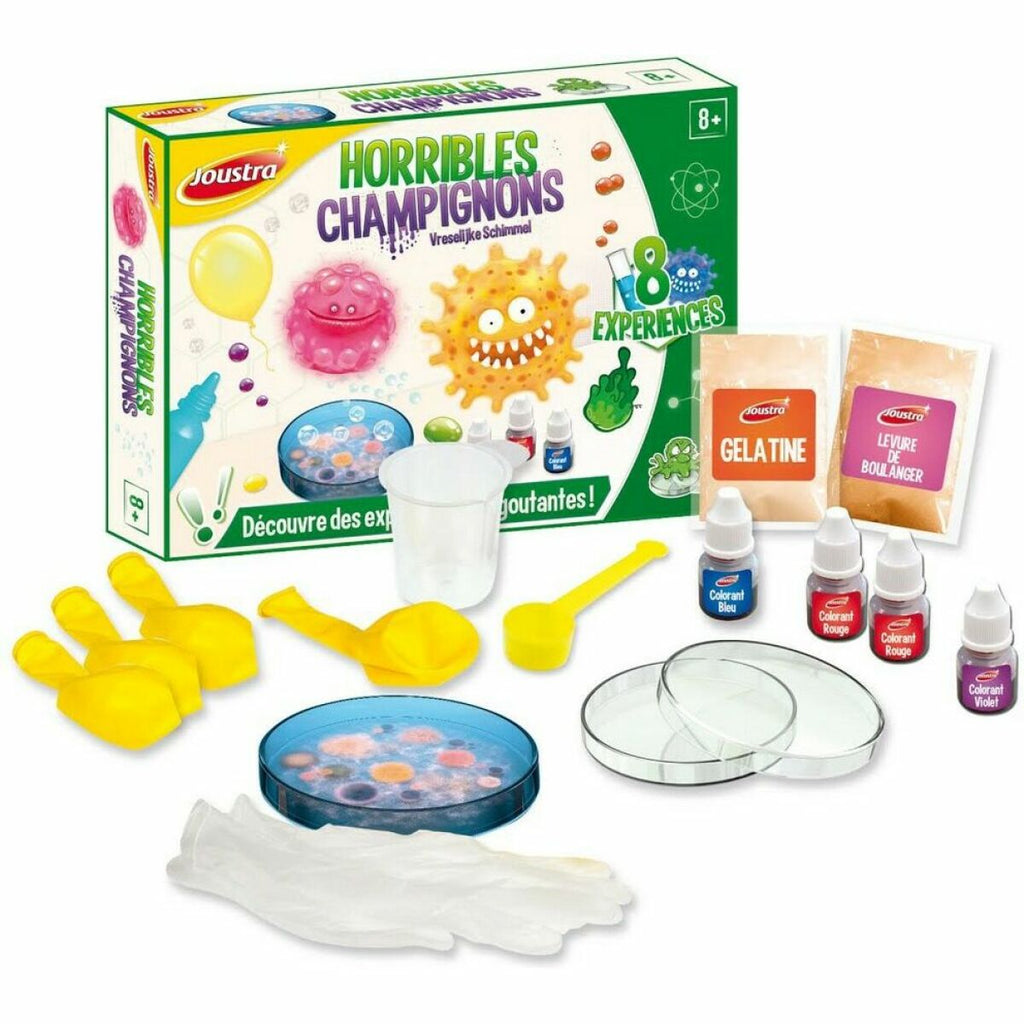 Joustra, Een grote doos vol met experimenten op het gebied van schimmels. De doos bevat: 4 ballonnen, 1 maatbeker, 1 petrischaal, 1 zakje gelatine, 1 zakje bakkersgist, 1 paar handschoenen, 1 lepel, 1 flesje met kleurstof en instructievellen. Daarmee kun je eindeloos experimenteren. Volg de instructies en kijkt netjes naar je proefje lukt, of bedenk zelf een experiment. Advies leeftijd vanaf 8 jaar.