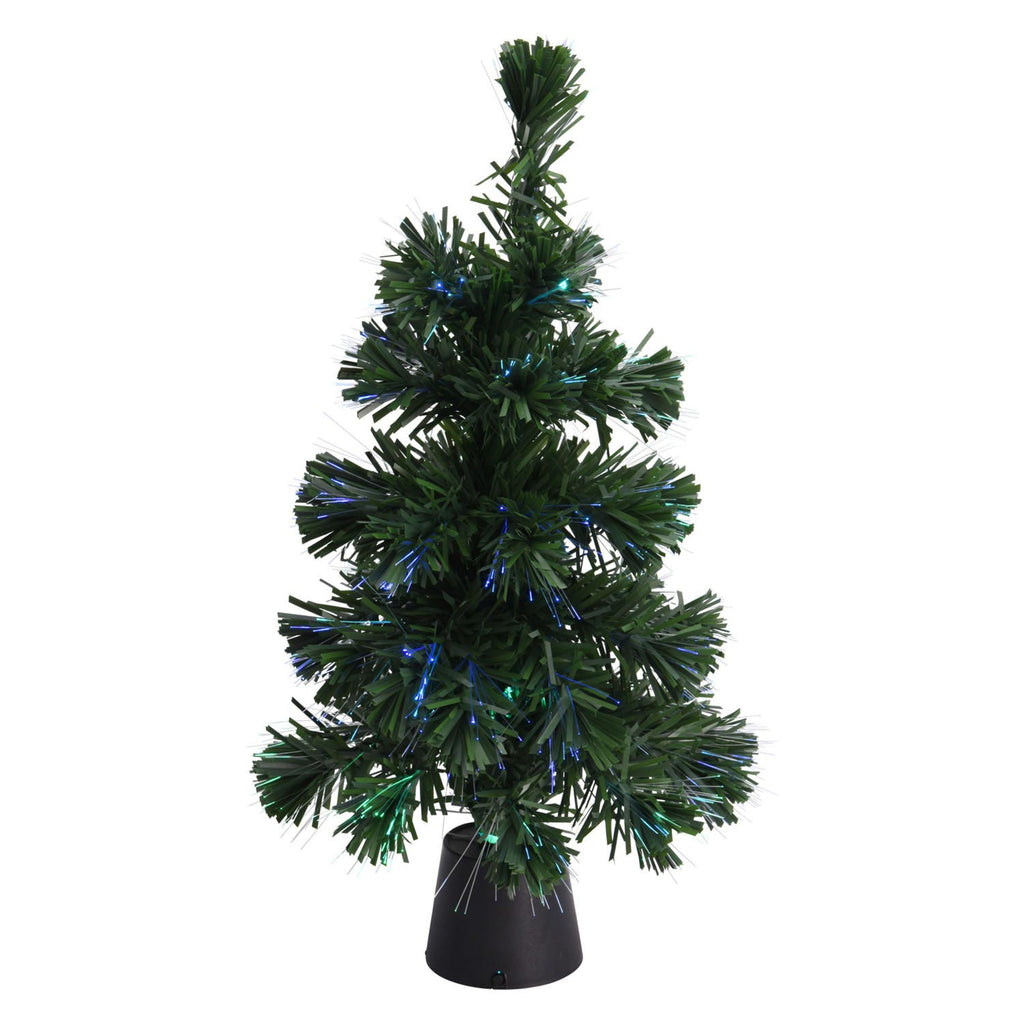 Kunstkerstboom van 45 centimeter hoog met fiber ledverlichting in veelkleurig. Geschikt voor binnen en buiten bereik van kinderen onder de 3 jaar oud te houden. Werkt op 3 AA-batterijen.